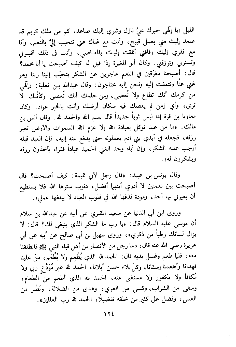 الليل: "يا الهى خيرك على نازل وشرى اليك صاعد كم من ملك كريم قد صعد اليك منى بعمل قبيح وأنت مع غناك عنى تتحبب إلى بالنعم وأنا مع فقرى اليك وفاقتى أتمقت اليك بالمعاصى وأنت في ذلك تجبرنى وتسترنى وترزقنى وكان أبو المغيرة اذا قيل له كيف أصبحت يا أبا محمد أصبحنا مغرقين في النعم عاجزين عن الشكر يتحبب الينا ربنا وهو غنى عنا ونتمقت اليه ونحن اليه محتاجون وقال عبد الله بن ثعلبة الهى من كرمك أنك تطاع ولا تعصى ومن حلمك أنك تعصى وكأنك لا ترى وأى زمن لم يعصك فيه سكان أرضك وأنت بالخير عواد وكان معاوية بن قرة اذا لبس ثوبا جديدا قال بسم الله والحمد لله وقال أنس بن مالك ما من عبد توكل بعبادة الله الا عزم الله السموات والارض تعبر رزقه فجعله في أيدى بنى آدم يعملونه حتى يدفع عنه اليه فإن العبد قبله أوجب عليه الشكر وان أباه وجد الغنى الحميد عبادا فقراء يأخذون رزقه ويشكرون له".