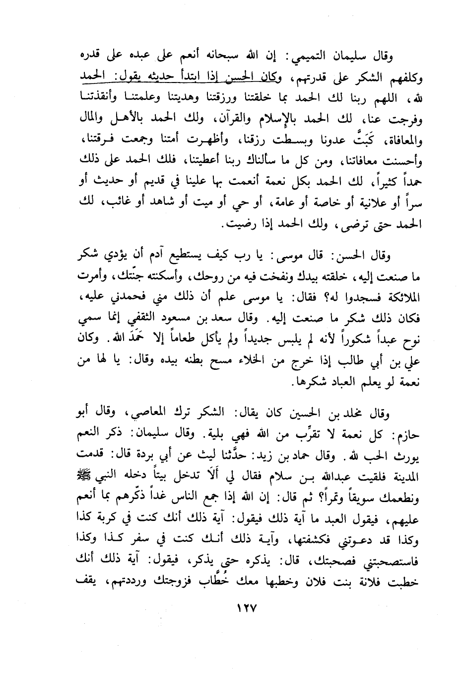 وقال سليمان التيمى ان الله سبحانه أنعم على عبده على قدره وكلفهم الشكر على قدرتهم وكان الحسن اذا ابتدأ حديثه يقول الحمد لله اللهم ربنا لك الحمد بما خلقتنا ورزقتنا وهديتنا وعلمتنا وأنقذتنا وفرجت عنا لك الحمد بالاسلام والقرآن ولك الحمد بالأهل والمال والمعافاة كبت عدونا وبسطت رزقنا وأظهرت أمننا وجمعت فرقتنا وأحسنت معافاتنا ومن كل ما سألناك ربنا أعطيتنا فلك الحمد على ذلك حمدا كثيرا لك الحمد بكل نعمة أنعمت بها علينا في قديم أو حديث أو سر أو علانية أو خاصة أو عامة أو حى أو ميت أو شاهد أو غائب لك الحمد حتى ترضى ولك الحمد اذا رضيت