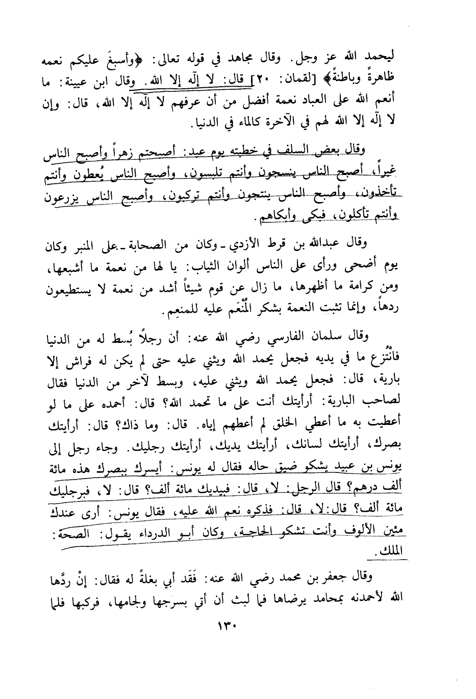 ليحمد الله عزوجل وقال مجاهد في قوله تعالى {وَأَسْبَغَ عَلَيْكُمْ نِعَمَهُ ظَاهِرَةً وَبَاطِنَةً} قال لا إله الا الله وقال ابن عيينة ما أنعم الله على العباد نعمة أفضل من أن عرفهم لا إله إلا الله قال وان لا اله الا الله لهم في الآخرة كالماء في الدنيا وقال بعض السلف في خطبته يوم عيد أصبحتم زهرا وأصبح الناس غبرا أصبح الناس ينسجون وأنتم تلبسون واصبح الناس يعطون وأنتم تأخذون وأصبح الناس ينتجون وأنتم تركبون واصبح الناس يزرعون وأنتم تأكلون فبكى وأبكاهم