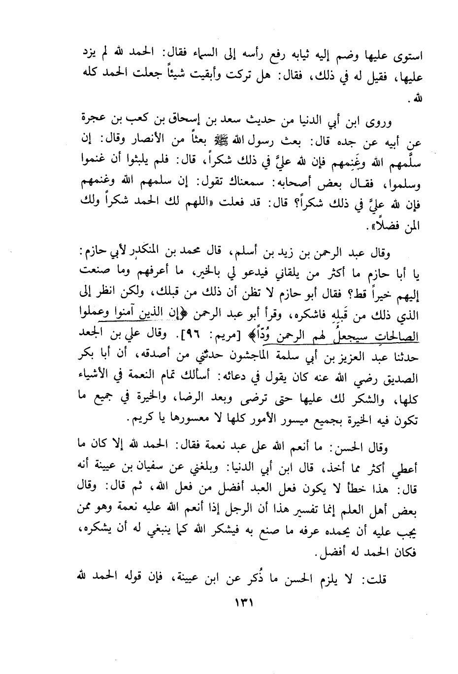 وقال الحسن ما أنعم الله على عبد نعمة فقال الحمد لله الا كان ما أعطى أكثر مما أخذ قال ابن أبى الدنيا وبلغنى عن سفيان بن عيينة أنه قال هذا خطأ لا يكون فعل العبد أفضل من فعل الله ثم قال وقال بعض أهل العلم انما تفسير هذا أن الرجل اذا أنعم الله عليه نعمة وهو ممن يجب عليه أن يحمده عرفه ما صنع به فيشكر الله كما ينبغى له أن يشكره فكان الحمد له أفضل