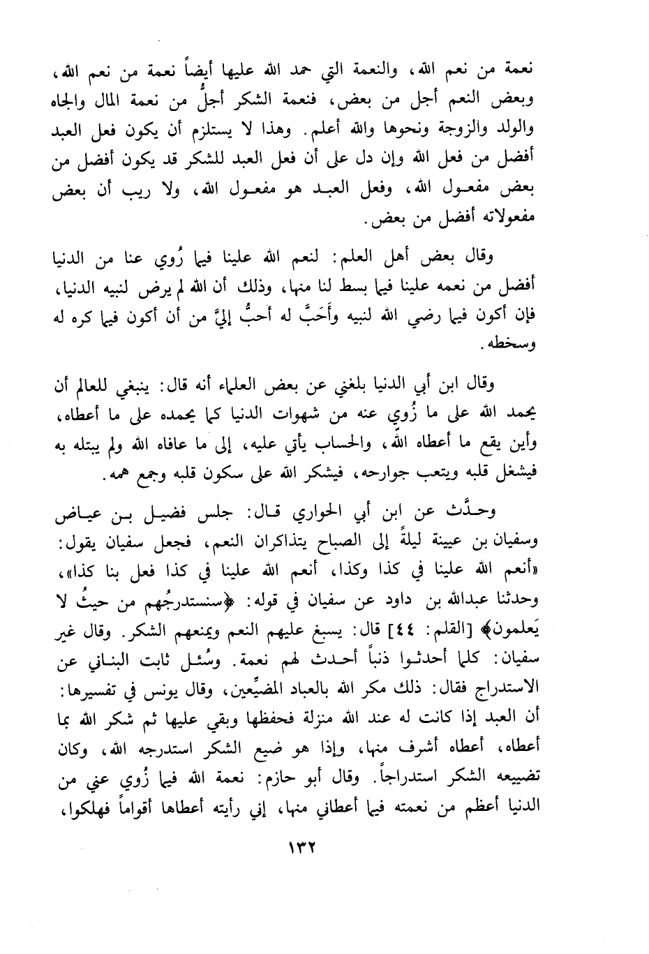 وحدث عن ابن أبى الحوارى قال جلس فضيل بن عياض وسفيان بن عيينة ليلة إلى الصباح يتذاكران النعم فجعل سفيان يقول أنعم الله علينا في كذا وكذا أنعم الله علينا في كذا فعل بنا كذا وحدثنا عبد الله بن داود عن سفيان في قوله {سَنَسْتَدْرِجُهُمْ مِنْ حَيْثُ لا يَعْلَمُونَ} قال يسبغ عليهم النعم ويمنعهم الشكر وقال غير سفيان كلما أحدثوا ذنبا أحدث لهم نعمة وسئل ثابت البنانى عن الاستدراج فقال ذلك مكر الله بالعباد المضيعين وقال يونس في تفسيرها ان العبد اذا كانت له عند الله منزلة فحفظها وبقى عليها ثم شكر الله بما أعطاه أعطاه أشرف منها واذا هو ضيع الشكر استدرجه الله وكان تضييعه الشكر استدراجا وقال أبو حازم نعمة الله فيما زوى عنى من الدنيا أعظم من نعمته فيما أعطانى منها انى رأيته أعطاها أقواما فهلكوا