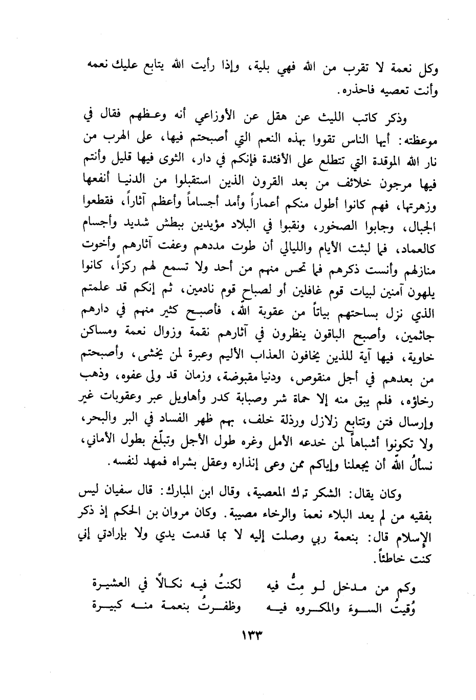 وكان يقال الشكر ترك المعصيه وقال ابن المبارك قال سفيان ليس بفقيه فمن لم يعد البلاء نعمه والرخاء مصيبه وكان مروان بن الحكم اذا ذكر الاسلام قال بنعمة ربى وصلت اليه لا بما قدمت يدى ولا بإرادتى انى كنت خاطئا