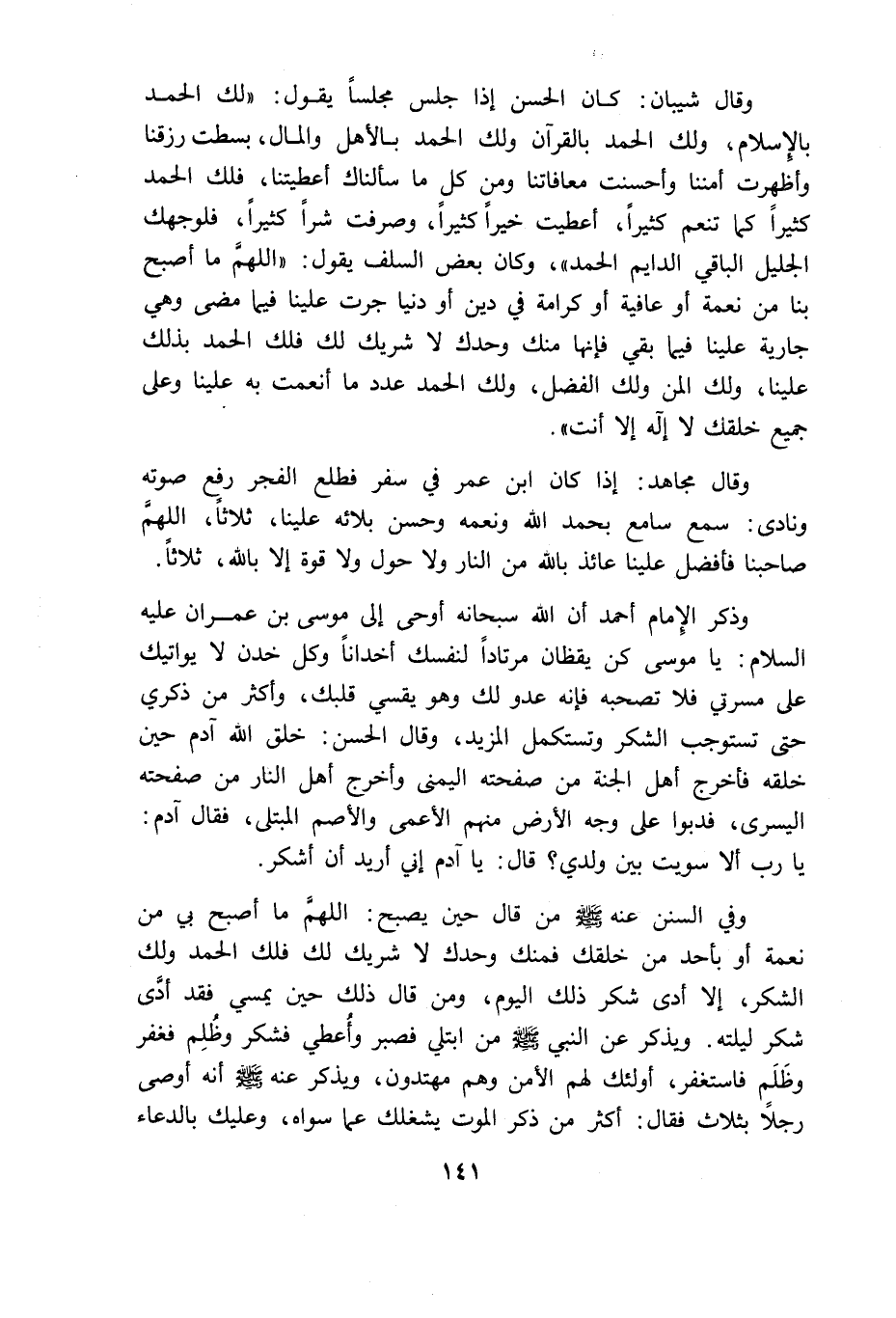 وفي السنن عنه من قال حين يصبح: "اللهم ما أصبح بى من نعمة أو بأحد من خلقك فمنك وحدك لا شريك لك فلك الحمد ولك الشكر الا أدى شكر ذلك اليوم ومن قال ذلك حين يمسى فقد أدى شكر ليلته" ويذكر عن النبي من ابتلى فصبر وأعطى فشكر وظلم فغفر وظلم فاستغفر أولئك لهم الامن وهم مهتدون ويذكر عنه أنه أوصى رجلا بثلاث فقال أكثر من ذكر الموت يشغلك عما سواه وعليك بالدعاء