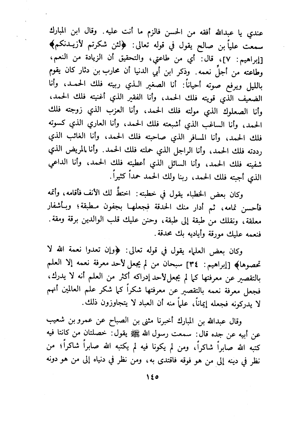 عندى يا عبد الله أفقه من الحسن فالزم ما أنت عليه وقال ابن المبارك سمعت عليا بن صالح يقول في قوله تعالى {لَئِنْ شَكَرْتُمْ لأَزِيدَنَّكُمْ} قال أى من طاعتى والتحقيق أن الزيادة من النعم وطاعته من أجل نعمه وذكر أبن أبى الدنيا أن محارب بن دثار كان يقوم بالليل ويرفع صوته أحيانا أنا الصغير الذى ربيته فلك الحمد وأنا الضعيف الذى قويته فلك الحمد وأنا الفقير الذى أغنيته فلك الحمد وأنا الصعلوك الذى مولته فلك الحمد وأنا العزب الذى زوجته فلك الحمد وأنا الساغب الذى أشبعته فلك الحمد وأنا العارى الذى كسوته فلك الحمد وأنا المسافر الذى صاحبته فلك الحمد وأنا الغائب الذى رددته فلك الحمد وأنا الراجل الذى حملته فلك الحمد وأنا المريض الذى شفيته فلك الحمد وأنا السائل الذى أعطيته فلك الحمد وأنا الداعى الذى أجبته فلك الحمد ربنا ولك الحمد حمدا كثيرا