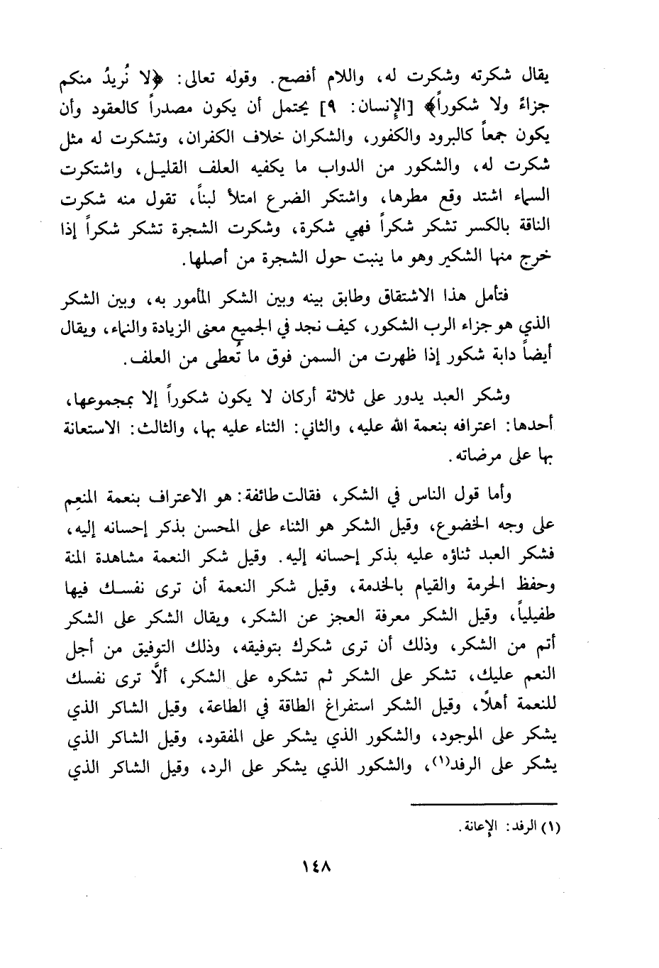 وشكر العبد يدور على ثلاثة أركان لا يكون شكورا الا بمجموعها أحدها اعترافه بنعمة الله عليه والثانى الثناء عليه بها والثالث الاستعانة بها على مرضاته