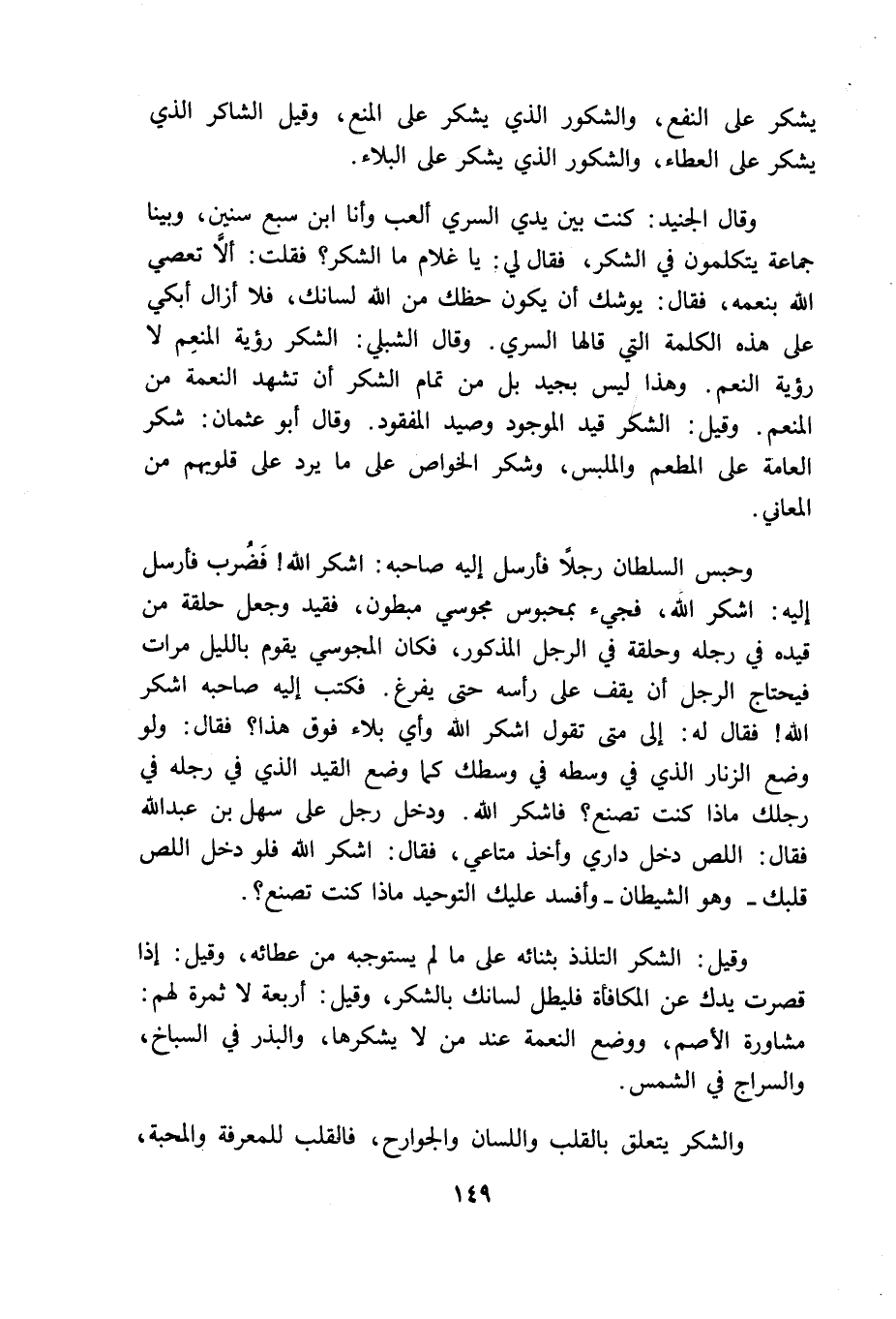 وقال الجنيد كنت بين يدى السرى ألعب وأنا ابن سبع سنين وبيننا جماعة يتكلمون فى الشكر فقال لى ياغلام ما الشكر فقلت ألا تعصى الله بنعمه فقال يوشك أن يكون حظك من الله لسانك فلا أزال أبكى على هذه الكلمة التى قالها السرى وقال الشبلى الشكر رؤية المنعم لا رؤية النعم وهذا ليس بجيد بل من تمام الشكر أن تشهد النعمة من المنعم وقيل الشكر قيد الموجود وصيد المفقود وقال أبو عثمان شكر العامة على المطعم والملبس وشكر الخواص على ما يرد على قلوبهم من المعانى