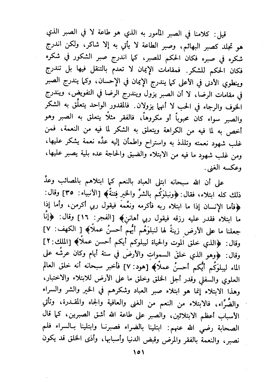 قيل: كلامنا فى الصبر المأمور به الذى هو طاعة لا فى الصبر الذى هو تجلد كصبر البهائم وصبر الطاعة لا يأتي به إلا شاكر ولكن اندرج شكره في صبره فكان الحكم للصبر كما اندرج صبر الشكور فى شكره فكان الحكم للشكر فمقامات الايمان لا تعدم بالتنقل فيها بل تندرج وينطوى الادنى فى الاعلى كما يندرج الايمان فى الاحسان وكما يندرج الصبر فى مقامات الرضا لا أن الصبر يزول ويندرج الرضا فى التفويض ويندرج الخوف والرجاء فى الحب لا أنهما يزولان فالمقدور الواحد يتعلق به الشكر والصبر سواء كان محبوبا أو مكروها فالفقر مثلا يتعلق به الصبر وهو أخص به لما فيه من الكراهة ويتعلق به الشكر لما فيه من النعمة فمن غلب شهود نعمته وتلذذ به واستراح واطمأن اليه عده نعمة يشكر عليها ومن غلب شهود ما فيه من الابتلاء والضيق والحاجة عده بلية يصبر عليها وعكسه الغنى