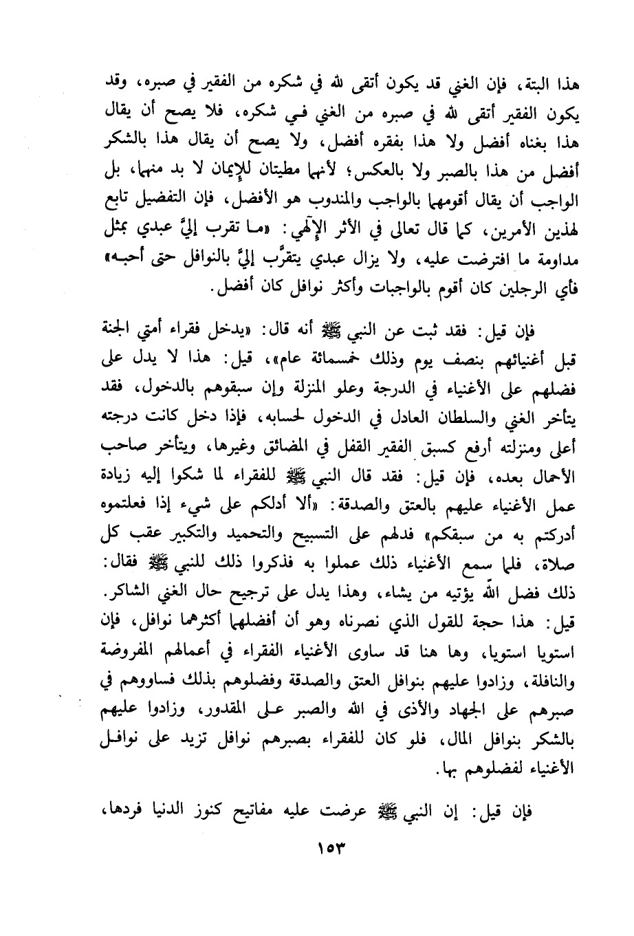 هذا البته فان الغنى قد يكون أتقى لله فى شكره من الفقير فى صبره وقد يكون الفقير أتقى لله فى صبره من الغنى فى شكره فلا يصح أن يقال هذا بغناه أفضل ولا هذا بفقره أفضل ولا يصح أن يقال هذا بالشكر أفضل من هذا بالصبر ولا بالعكس لأنهما مطيتان للايمان لا بد منهما بل الواجب أن يقال أقومهما بالواجب والمندوب هو الافضل فان التفضيل تابع لهذين الأمرين كما قال تعالى فى الاثر الالهى: "ما تقرب الى عبدى بمثل مداومة ما افترضت عليه ولا يزال عبدى يتقرب الى بالنوافل حتى أحبه" فأى الرجلين كان أقوم بالواجبات وأكثر نوافل كان أفضل