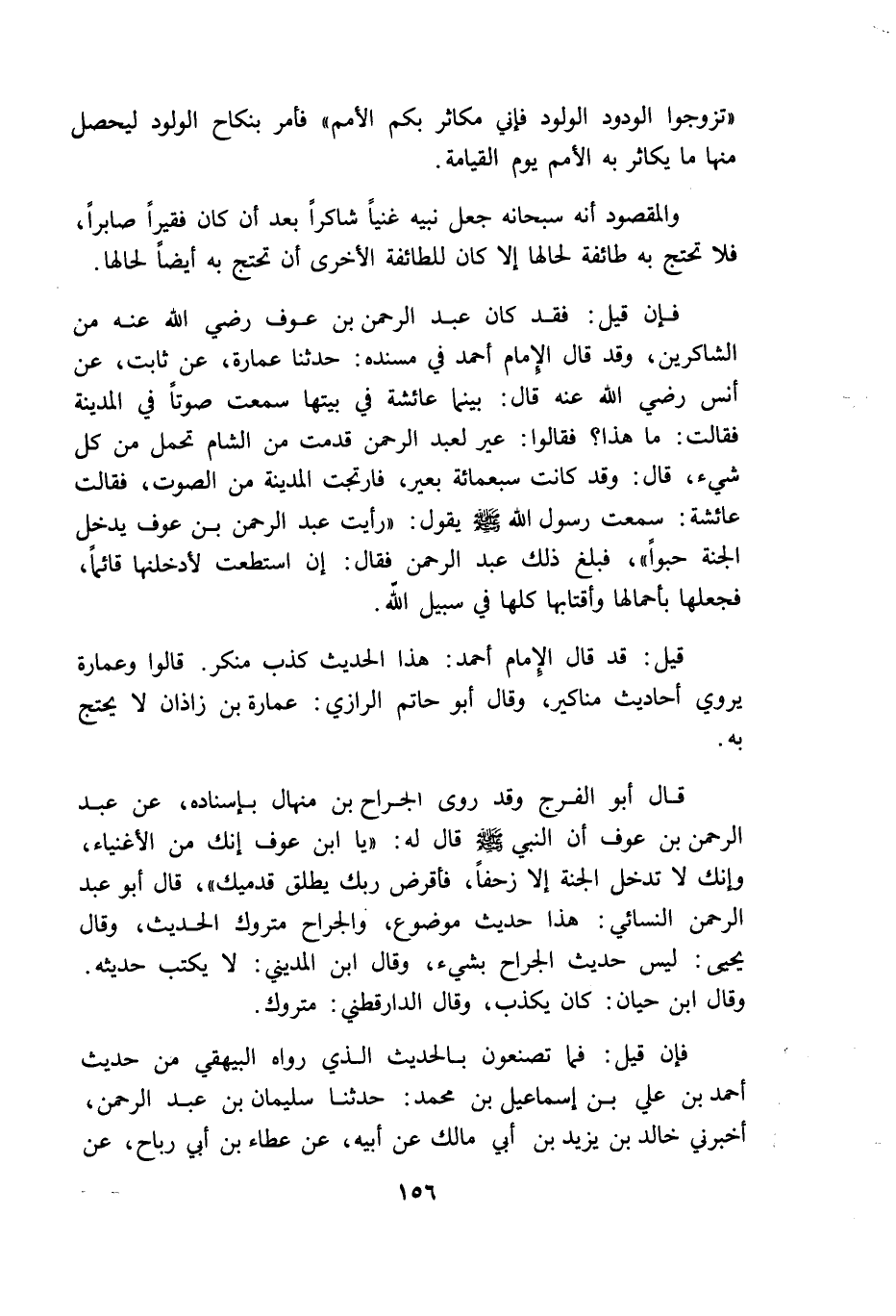 قال أبو الفرج وقد روى الجراح بن منهال باسناده عن عبد الرحمن بن عوف أن النبى قال له: "يا ابن عوف إنك من الأغنياء وإنك لا تدخل الجنة إلا زحفا فأقرض ربك يطلق قدميك" قال أبو عبد الرحمن النسائى هذا حديث موضوع والجراح متروك الحديث وقال يحيى ليس حديث الجراح بشئ وقال ابن المدينى لا يكتب حديثه وقال ابن حبان كان يكذب وقال الدارقطنى متروك
