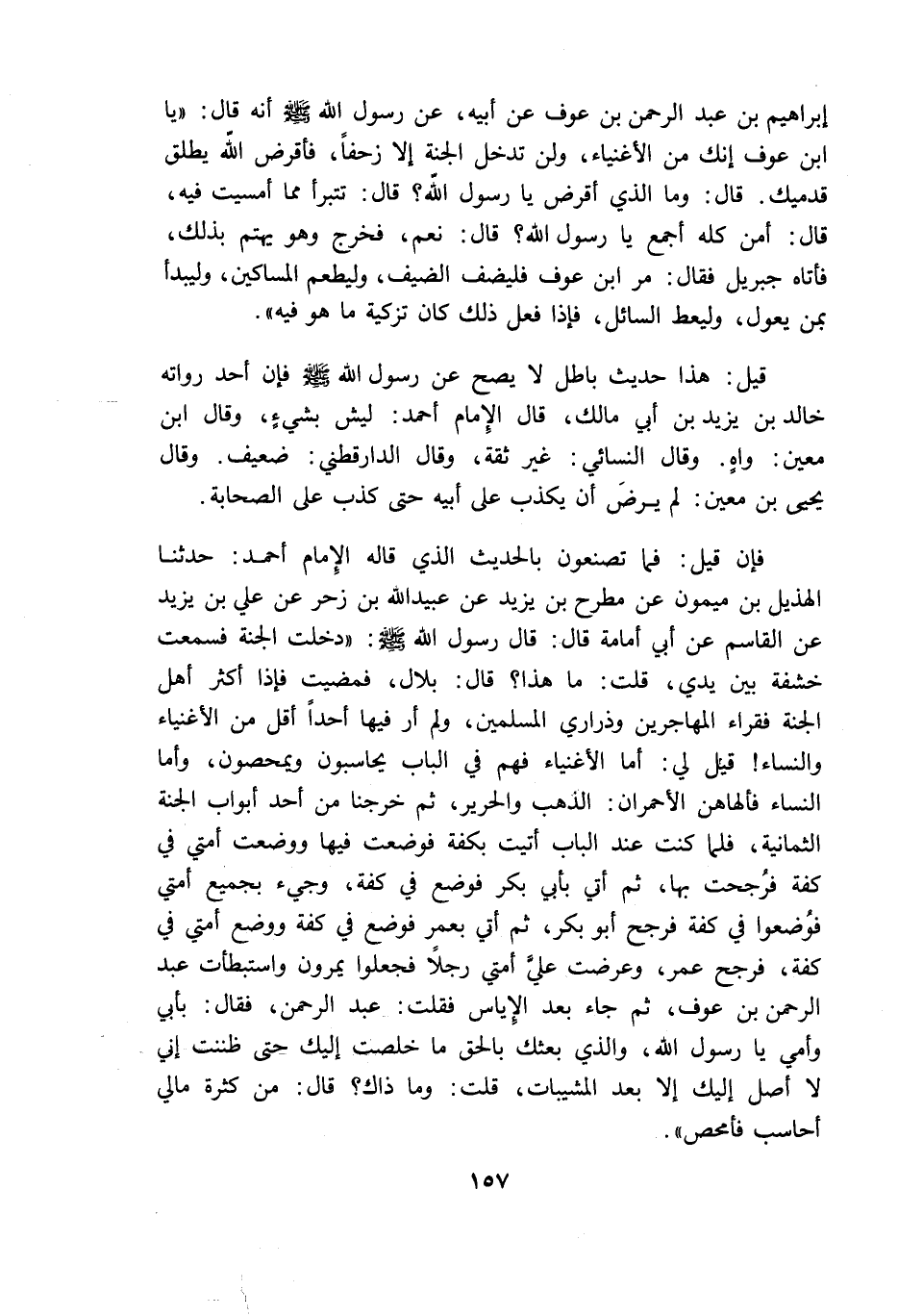 إبراهيم بن عبد الرحمن بن عوف عن أبيه عن رسول الله أنه قال: "يا ابن عوف إنك من الاغنياء ولن تدخل الجنة إلا زحفا فأقرض الله يطلق قدميك" قال وما الذى أقرض يا رسول الله قال تتبرأ مما أمسيت فيه قال أمن كله أجمع يا رسول الله قال نعم فخرج وهو يهتم بذلك فأتاه جبريل فقال مر ابن عوف فليضف الضيف وليطعم المساكين وليبدأ بمن يعول وليعط السائل فاذا فعل ذلك كان تزكية ما هو فيه".