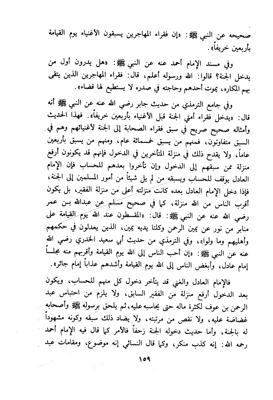 وفى جامع الترمذى من حديث جابر رضى الله عنه عن النبى أنه قال: "يدخل فقراء أمتى الجنة قبل الاغنياء بأربعين خريفا" فهذا الحديث وأمثاله صحيح صريح فى سبق فقراء الصحابة الى الجنة لأغنيائهم وهم فى السبق متفاوتون فمنهم من يسبق خمسمائة عام ومنهم من يسبق بأربعين عاما ولا يقدح ذلك فى منزلة المتأخرين فى الدخول فإنهم قد يكونون أرفع منزلة ممن سبقهم الى الدخول وان تأخروا بعدهم للحساب فان الامام العادل يوقف للحساب ويسبقه من لم يل شيئا من أمور المسلمين الى الجنة فاذا دخل الامام العادل بعده كانت منزلته أعلى من منزلة الفقير بل يكون أقرب الناس من الله منزلة كما فى صحيح مسلم عن عبد الله بن عمر رضى الله عنه عن النبى قال: "المقسطون عند الله يوم القيامة على منابر من نور عن يمين الرحمن وكلتا يديه يمين الذين يعدلون فى حكمهم وأهليهم وما ولوا" وفى الترمذى من حديث أبى سعيد الخدرى رضى الله عنه عن النبى: "أن أحب الناس الى الله يوم القيامة واقربهم منه مجلسا امام عادل وأبغض الناس الى الله يوم القيامة وأشدهم عذابا امام جائر"