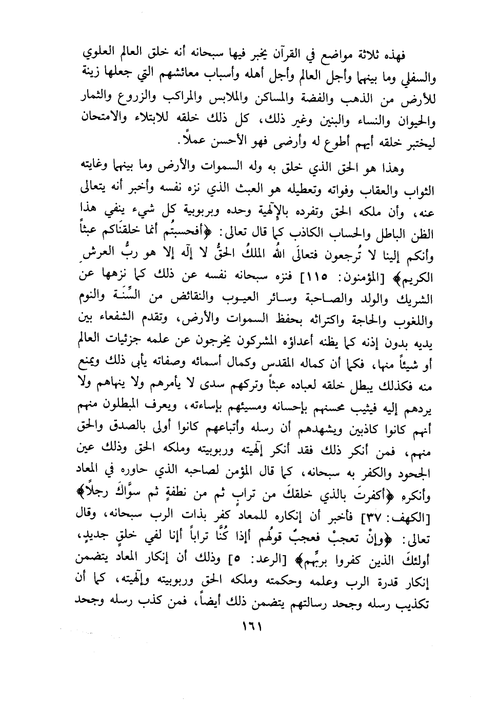 وهذا هو الحق الذى خلق به وله السموات والارض وما بينهما وغايته الثواب والعقاب وفواته وتعطيله هو العبث الذى نزه نفسه عنه وأخبر أنه يتعالى عنه وأن ملكه الحق وتفرده بالالهية وحده وبربوبية كل شئ ينفى هذا الظن الباطل والحساب الكاذب كما قال تعالى {أَفَحَسِبْتُمْ أَنَّمَا خَلَقْنَاكُمْ عَبَثاً وَأَنَّكُمْ إِلَيْنَا لا تُرْجَعُونَ فَتَعَالَى اللَّهُ الْمَلِكُ الْحَقُّ لا إِلَهَ إِلَّا هُوَ رَبُّ الْعَرْشِ الْكَرِيمِ} فنزه سبحانه نفسه عن ذلك كما نزهها عن الشريك والولد والصاحبة وسائر العيوب والنقائص من السنة والنوم واللغوب والحاجة واكتراثه بحفظ السموات والارض وتقدم الشفعاء بين يديه بدون اذنه كما يظنه أعداؤه المشركون يخرجون عن علمه جزئيات العالم أو شيئا منها فكما أن كماله المقدس وكمال أسمائه وصفاته يأبى ذلك ويمنع منه فكذلك يبطل خلقه لعباده عبثا وتركهم سدى لا يأمرهم ولا ينهاهم ولا يردهم اليه فيثيب محسنهم بإحسانه ومسيئهم باساءته ويعرف المبطلون منهم انهم كانوا كاذبين ويشهدهم أن رسله وأتباعهم كانوا اولى بالصدق والحق منهم فمن أنكر ذلك فقد انكر إلهيته وربوبيته وملكه الحق وذلك عين الجحود والكفر به سبحانه كما قال المؤمن لصاحبه الذى حاوره فى المعاد وأنكره {أَكَفَرْتَ بِالَّذِي خَلَقَكَ مِنْ تُرَابٍ ثُمَّ مِنْ نُطْفَةٍ ثُمَّ سَوَّاكَ رَجُلاً} فأخبر أن انكاره للمعاد كفر بذات الرب سبحانه وقال تعالى وان تعجب فعجب قولهم أإذا كنا ترابا إنا لفى خلق جديد أولئك الذين كفروا بربهم وذلك أن انكار المعادى يتضمن انكار قدرة الرب وعلمه وحكمته وملكه الحق وربوبيته والهيته كما أن تكذيب رسله وجحد رسالتهم يتضمن ذلك ايضا فمن كذب رسله وجحد