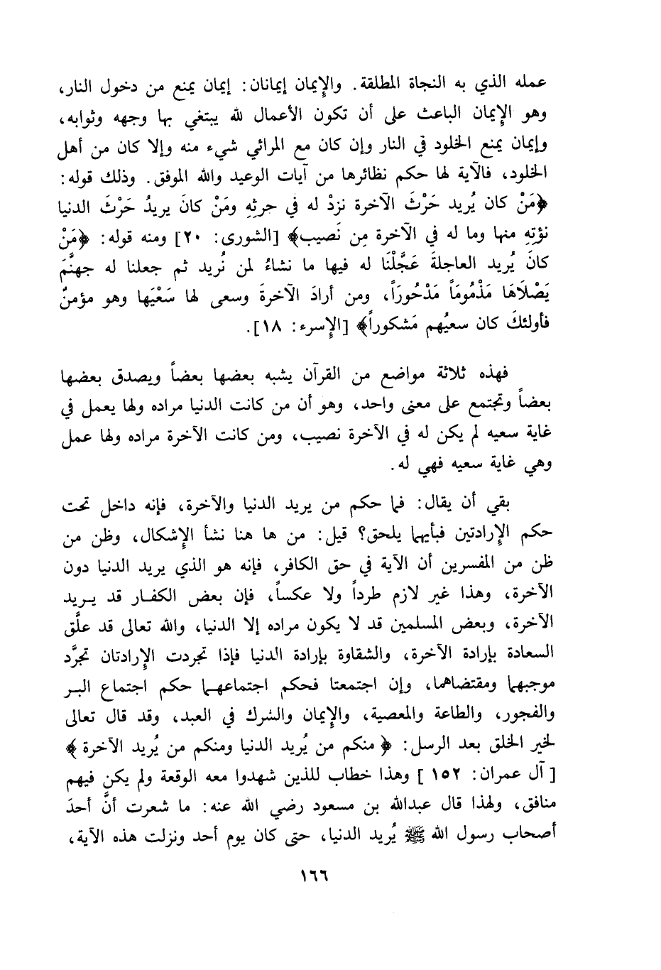 بقى أن يقال: فما حكم من يريد الدنيا والاخرة فانه داخل تحت حكم الارادتين فبأيهما يلحق قيل من ها هنا نشأ الاشكال وظن من ظن من المفسرين أن الاية فى حق الكافر فانه هو الذى يريد الدنيا دون الاخرة وهذا غير لازم طردا ولا عكسا فان بعض الكفار قد يريد الاخرة وبعض المسلمين قد لا يكون مراده الا الدنيا والله تعالى قد علق السعادة بإرادة الاخرة والشقاوة بإرادة الدنيا فاذا تجردت الارادتان تجرد موجبهما ومقتضاهما وان اجتمعتا فحكم اجتماعهما حكم اجتماع البر والفجور والطاعة والمعصية والايمان والشرك فى العبد وقد قال تعالى لخير الخلق بعد الرسل {مِنْكُمْ مَنْ يُرِيدُ الدُّنْيَا وَمِنْكُمْ مَنْ يُرِيدُ الآخِرَة} وهذا خطاب للذين شهدوا معه الوقعة ولم يكن فيهم منافق ولهذا قال عبد الله بن مسعود رضى الله عنه ما شعرت أن أحد أصحاب رسول الله يريد الدنيا حتى كان يوم أحد ونزلت هذه الاية