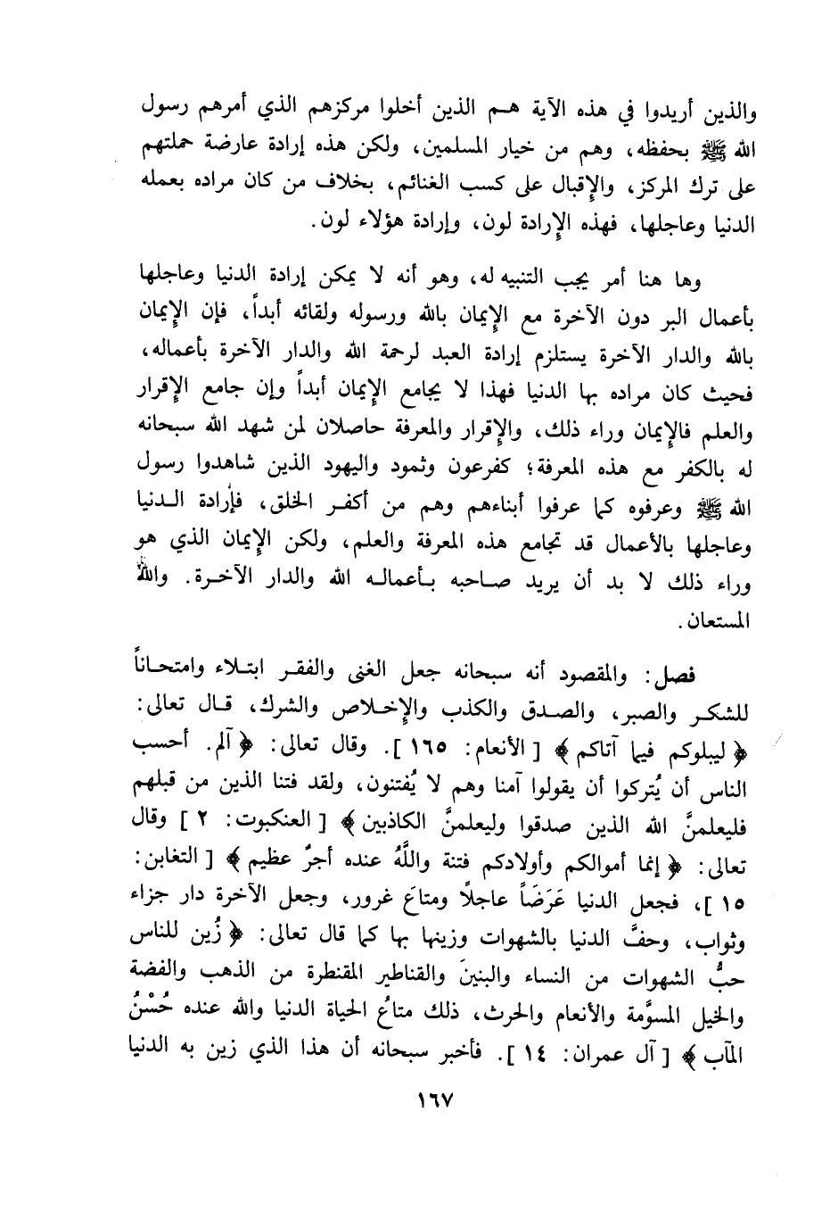 وها هنا أمر يجب التنبيه له وهو أنه لا يمكن ارادة الدنيا وعاجلها بأعمال البر دون الاخرة مع الايمان بالله ورسوله ولقائه أبدا فان الايمان بالله والدار الاخرة يستلزم ارادة العبد لرحمة الله والدار الاخرة بأعماله فحيث كان مراده بها الدنيا فهذا لا يجامع الايمان أبدا وان جامع الاقرار والعلم فالايمان وراء ذلك والاقرار والمعرفة حاصلان لمن شهد الله سبحانه له بالكفر مع هذه المعرفة كفرعون وثمود واليهود الذين شاهدوا رسول الله وعرفوه كما عرفوا أبناءهم وهم من أكفر الخلق بإرادة الدنيا وعاجلها بالاعمال قد تجامع هذه المعرفة والعلم ولكن الايمان الذى هو وراء ذلك لا بد أن يريد صاحبه بأعماله الله والدار الآخرة والله المستعان