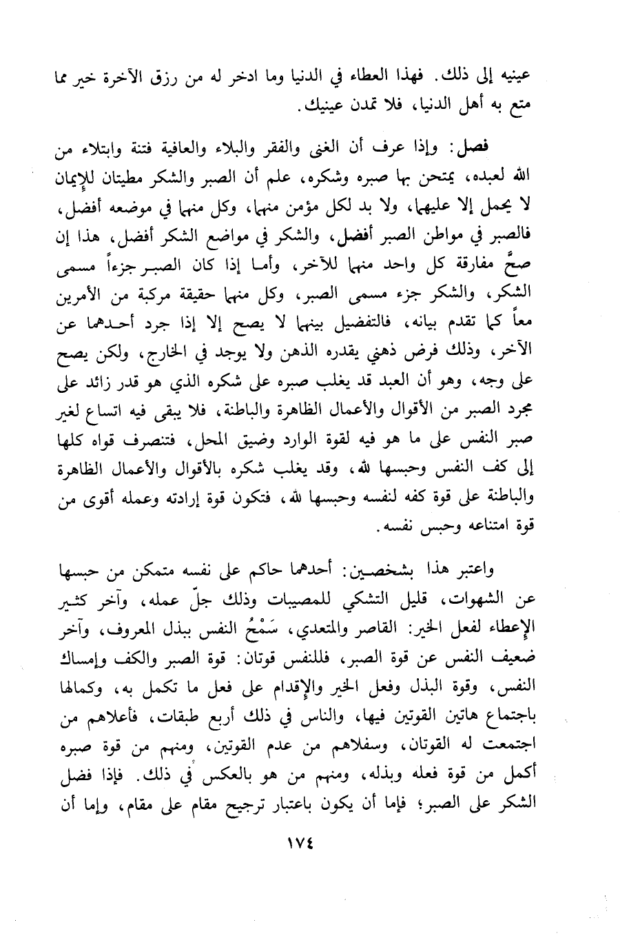 واعتبر هذا بشخصين أحدهما حاكم على نفسه متمكن من حبسها عن الشهوات قليل التشكى للمصيبات وذلك جل عمله وآخر كثير الاعطاء لفعل الخير القاصر والمتعدى سمح النفس ببذل المعروف وآخر ضعيف النفس عن قوة الصبر فللنفس قوتان قوة الصبر والكف وامساك النفس وقوة البذل وفعل الخير والاقدام على فعل ما تكمل به وكمالها باجتماع هاتين القوتين فيها والناس فى ذلك أربع طبقات فأعلاهم من اجتمعت له القوتان وسفلتهم من عدم القوتين ومنهم من قوة صبره أكمل من قوة فعله وبذله ومنهم من هو بالعكس فى ذلك فإذا فضل الشكر على الصبر فإما أن يكون باعتبار ترجيح مقام على مقام واما أن