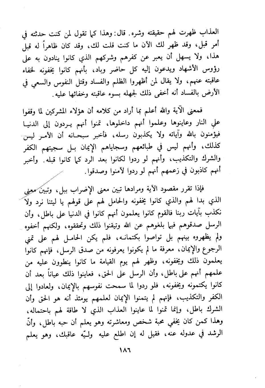 فإذا تقرر مقصود الآية ومرادها تبين معنى الاضراب ببل وتبين معنى الذى بدا لهم والذى كانوا يخفونه والحامل لهم على قولهم يا ليتنا نرد ولا نكذب بآيات ربنا فالقوم كانوا يعلمون أنهم كانوا فى الدنيا على باطل وأن الرسل صدقوهم فيما بلغوهم عن الله وتيقنوا ذلك وتحققوه ولكنهم أخفوه ولم يظهروه بينهم بل تواصوا بكتمانه فلم يكن الحامل لهم على تمنى الرجوع والايمان معرفة ما لم يكونوا يعرفونه من صدق الرسل فإنهم كانوا يعلمون ذلك ويخفونه وظهر لهم يوم القيامة ما كانوا ينطوون عليه من علمهم أنهم على باطل وأن الرسل على الحق فعاينوا ذلك عيانا بعد أن كانوا يكتمونه ويخفونه فلو ردوا لما سمحت نفوسهم بالايمان ولعادوا الى الكفر والتكذيب فإنهم لم يتمنوا الايمان لعلمهم يومئذ أنه هو الحق وأن الشرك باطل وانما تمنوا لما عاينوا العذاب الذى لا طاقة لهم باحتماله وهذا كمن كان يخفى محبة شخص ومعاشرته وهو يعلم أن حبه باطل وأن الرشد فى عدوله عنه فقيل له ان اطلع عليه وليه عاقبك وهو يعلم