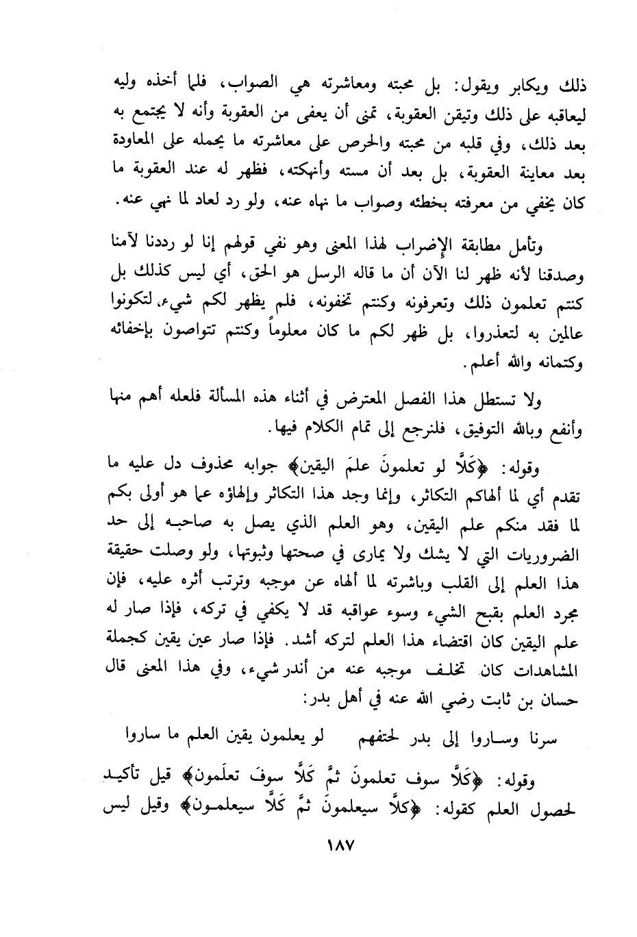 وقوله {كَلاَّ لَوْ تَعْلَمُونَ عِلْمَ الْيَقِينِ} جوابه محذوف دل عليه ما تقدم أى لما ألهاكم التكاثر وانما وجد هذا التكاثر وإلهاؤه عما هو أولى بكم لما فقد منكم علم اليقين وهو العلم الذى يصل به صاحبه الى حد الضروريات التى لا يشك ولا يمارى فى صحتها وثبوتها ولو وصلت حقيقة هذا العلم الى القلب وباشرته لما ألهاه عن موجبه ويرتب أثره عليه فإن مجرد العلم بقبح الشئ وسوء عواقبه قد لا يكفى فى تركه فإذا صار له علم اليقين كان اقتضاء هذا العلم لتركه أشد فاذا صار عين يقين كجملة المشاهدات كان تخلف موجبه عنه من أندر شئ وفى هذا المعنى قال حسان بن ثابت رضى الله عنه فى أهل بدر: