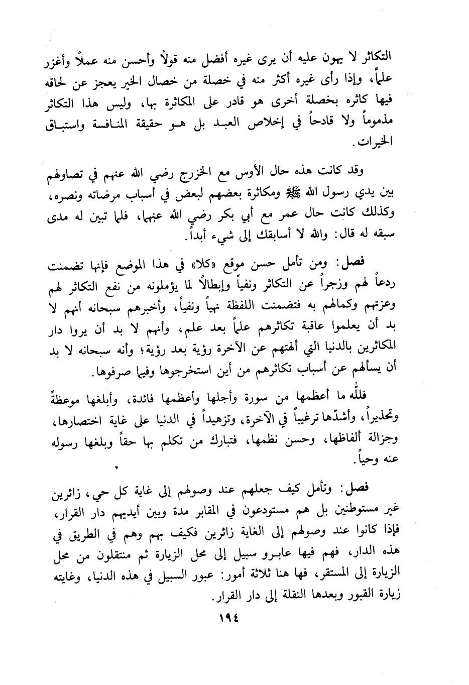 التكاثر لا يهون عليه أن يرى غيره أفضل منه قولا وأحسن منه عملا وأغزر علما واذا رأى غيره أكثر منه فى خصلة من خصال الخير يعجز عن لحاقه فيها كاثره بخصلة أخرى هو قادر على المكاثرة بها وليس هذا التكاثر مذموما ولا قادحا فى اخلاص العبد بل هو حقيقة المنافسة واستباق الخيرات