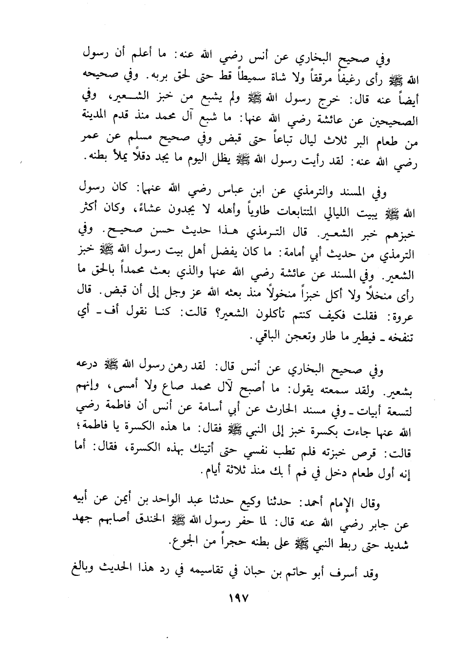 وفى صحيح البخارى عن أنس رضى الله عنه ما أعلم أن رسول الله رأى رغيفا مرققا ولا شاة سميطا قط حتى لحق بربه وفى صحيحه أيضا عنه قال خرج رسول الله ولم يشبع من خبز الشعير وفى الصحيحين عن عائشة رضى الله عنها: "ما شبع آل محمد منذ قدم المدينة من طعام البر ثلاث ليال تباعا حتى قبض" وفى صحيح مسلم عن عمر رضى الله عنه: "لقد رأيت رسول الله يظل اليوم ما يجد دقلا يملأ بطنه"