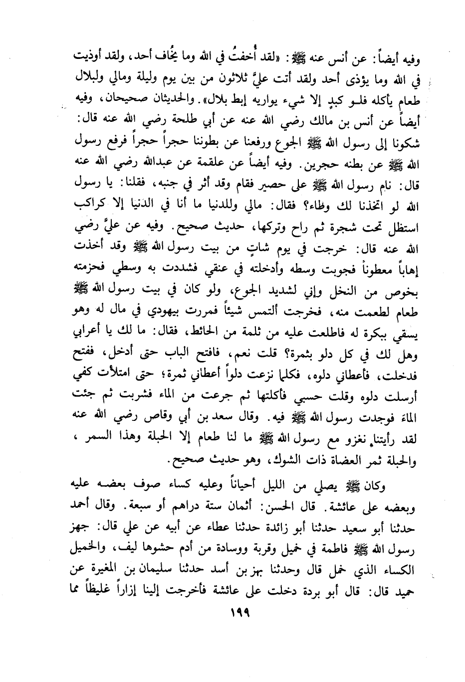 وفيه أيضا عن أنس عنه: "لقد اخفت فى الله وما يخاف أحد ولقد أوذيت فى الله وما يؤذى أحد ولقد أتت على ثلاثون من بين يوم وليلة ومالى ولبلال طعام يأكله ولبد إلا شئ يواريه إبط بلال" والحديثان صحيحان وفيه ايضا عن أنس بن مالك رضى الله عنه عن أبى طلحة رضى الله عنه قال: "شكونا الى رسول الله الجوع ورفعنا عن بطوننا حجرا حجرا فرفع رسول الله عن بطنه حجرين" وفيه أيضا عن علقمة عن عبد الله رضى الله عنه قال: "نام رسول الله على حصير فقام وقد اثر فى جنبه فقلنا يا رسول الله لو اتخذنا لك وطاء فقال مالى وللدنيا ما أنا فى الدنيا الا كراكب استظل تحت شجرة ثم راح وتركها" حديث صحيح وفيه عن على رضى الله عنه قال: "خرجت فى يوم شات من بيت رسول الله وقد أخذت اهابا معطونا فجوبت وسطه وأدخلته فى عنقى فشددت به وسطى فحزمته بخوص من النخل وانى لشديد الجوع ولو كان فى بيت رسول الله طعام لطعمت منه فخرجت التمس شيئا فمررت بيهودى فى مال له وهو يسقى ببكرة له فاطلعت عليه من ثلمة من الحائط فقال مالك يا أعرابى وهل لك فى كل دلو بتمرة قلت نعم فافتتح الباب حتى أدخل ففتح فدخلت فأعطانى دلوه فكلما نزعت دلوا أعطانى تمرة حتى امتلأت كفى أرسلت دلوه وقلت حسبى فأكلتها ثم جرعت من الماء فشربت ثم جئت الماء فوجدت رسول الله فيه وقال سعد بن ابى وقاص رضى الله عنه لقد رأيتنا نغزو مع رسول الله ما لنا طعام الا الحبلة وهذا السمر والحبلة ثمر العضاة ذات الشوك" وهو حديث صحيح