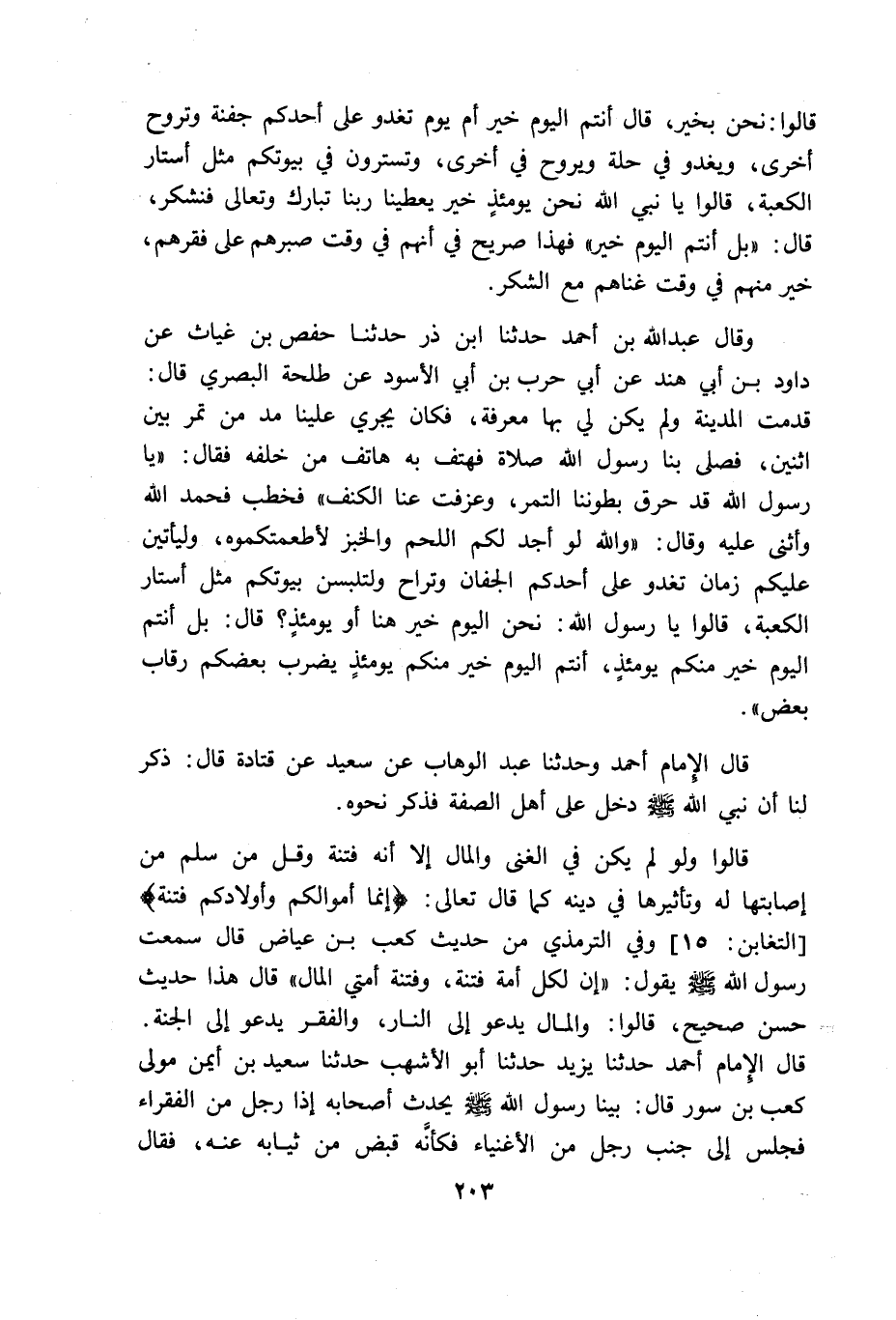 وقال عبد الله بن أحمد حدثنا أبن ذر حدثنا حفص بن غياث عن داود بن أبى هند عن أبى حرب بن أبى الاسود عن طلحة البصرى قال قدمت المدينة ولم يكن لى بها معرفة فكان يجرى علينا مد من تمر بين اثنين فصلى بنا رسول الله صلاة فهتف به هاتف من خلفه فقال يا رسول الله قد حرق بطوننا التمر وعرفت عنا الكنف فخطب فحمد الله وأثنى عليه وقال: "والله لو أجد لكم اللحم والخبز لأطعمتكموه وليأتين عليكم زمان تغدو على أحدكم الجفان وتراح ولتلبسن بيوتكم مثل أستار الكعبة قالوا يا رسول الله نحن اليوم خير منا أو يومئذ قال بل أنتم اليوم خير منكم يومئذ أنتم اليوم خير منكم يومئذ يضرب بعضكم رقاب بعض"