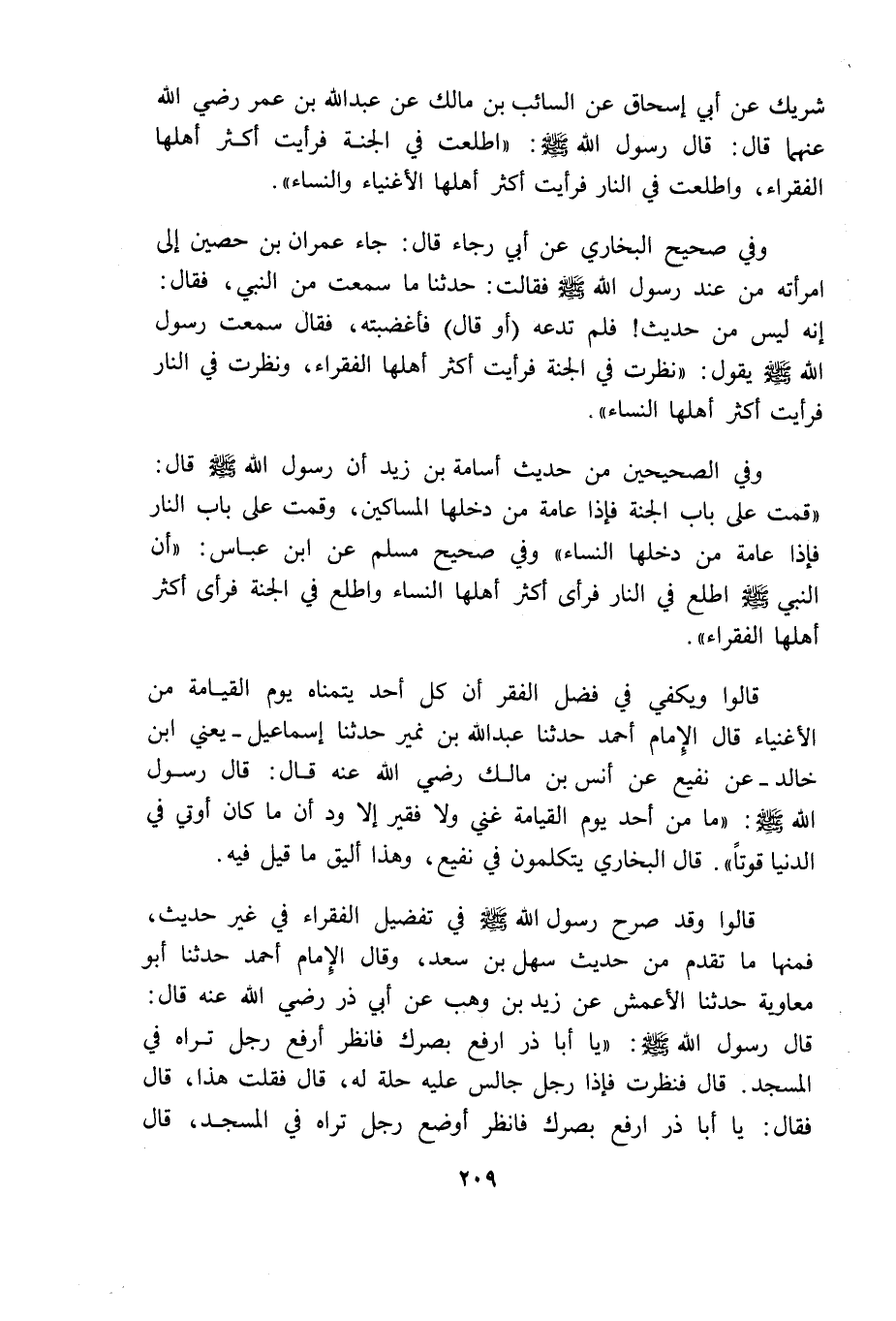 وفى صحيح البخارى عن أبى رجاء قال جاء عمران بن حصين الى امرأته من عند رسول الله فقالت حدثنا ما سمعت من النبى فقال انه ليس من حديث فلم تدعه أو قال فأغضبته فقال سمعت رسول الله يقول: "نظرت فى الجنة فرأيت أكثر أهلها الفقراء ونظرت فى النار فرأيت أكثر أهلها النساء".