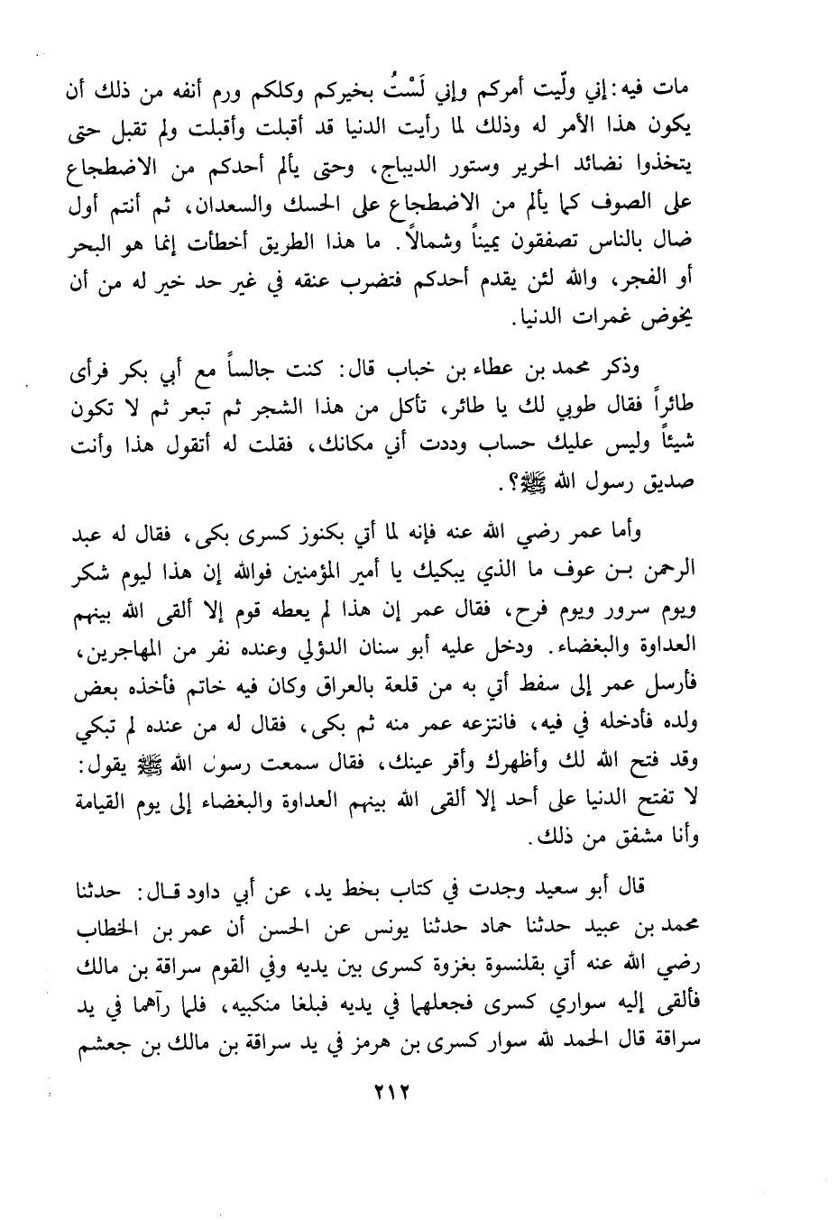 قال أبو سعيد وجدت فى كتاب بخط يدى عن أبى داود قال حدثنا محمد بن عبيد حدثنا حماد حدثنا يونس عن الحسن أن عمر بن الخطاب رضى الله عنه أتى بقلنسوة بغزوة كسرى بين يديه وفى القوم سراقة بن مالك فألقى اليه سوارى كسرى فجعلهما فى يديه فبلغا منكبيه فلما رآهما فى يد سراقة قال الحمد لله سوارا كسرى بن هرمز فى يد سراقة بن مالك بن جعشم