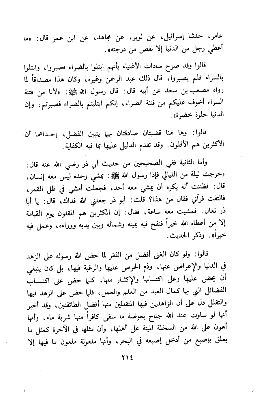 عامر حدثنا اسرائيل عن ثوير عن مجاهد عن ابن عمر قال: "ما أعطى رجل من الدنيا الا نقص من درجته".
