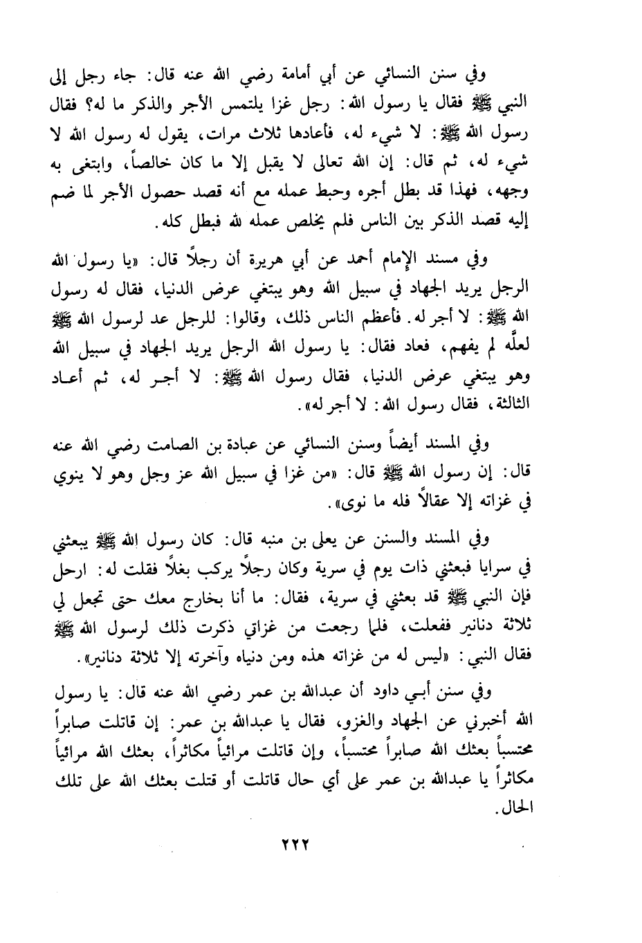 وفى مسند الامام أحمد عن أبى هريرة أن رجلا قال: "يارسول الله الرجل يريد الجهاد فى سبيل الله وهو يبتغى عرض الدنيا فقال له رسول الله لا أجر له فأعظم الناس ذلك وقالوا للرجل عد لرسول الله لعله لم يفهم فعاد فقال يا رسول الله الرجل يريد الجهاد فى سبيل الله وهو يبتغى عرض الدنيا فقال رسول الله لا أجر له ثم أعاد الثالثة فقال رسول الله لا أجر له".