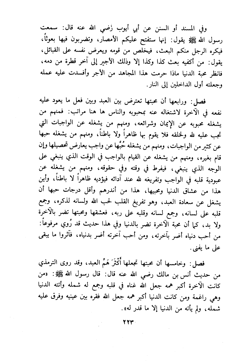 فصل: ورابعها أن محبتها تعترض بين العبد وبين فعل ما يعود عليه نفعه فى الآخرة لاشتغاله عنه بمحبوبه والناس ها هنا مراتب فمنهم من يشغله محبوبه عن الايمان وشرائعه ومنهم من يشغله عن الواجبات التى تجب عليه لله ولخلقه فلا يقوم بها ظاهرا ولا باطنا ومنهم من يشغله حبها عن كثير من الواجبات ومنهم من يشغله عن واجب يعارض تحصيلها وان قام بغيره ومنهم من يشغله عن القيام بالواجب فى الوقت الذى ينبغى على الوجه الذى ينبغى فيفرط فى وقته وفى حقوقه ومنهم من يشغله عن عبودية قلبه فى الواجب وتفريغه لله عند أدائه فيؤديه ظاهر الا باطنا وأين هذا من عشاق الدنيا ومحبيها هذا من أندرهم وأقل درجات حبها ان يشغل عن سعادة العبد وهو تفريغ القلب لحب الله ولسانه لذكره وجمع قلبه على لسانه وجمع لسانه وقلبه على ربه فعشقها ومحبتها تضر بالآخرة ولا بد كما أن محبة الآخرة تضر بالدنيا وفى هذا الحديث قد روى مرفوعا من أحب دنياه أضر بآخرته ومن أحب آخرته اضر بدنياه فآثروا ما يبقى على ما يفنى