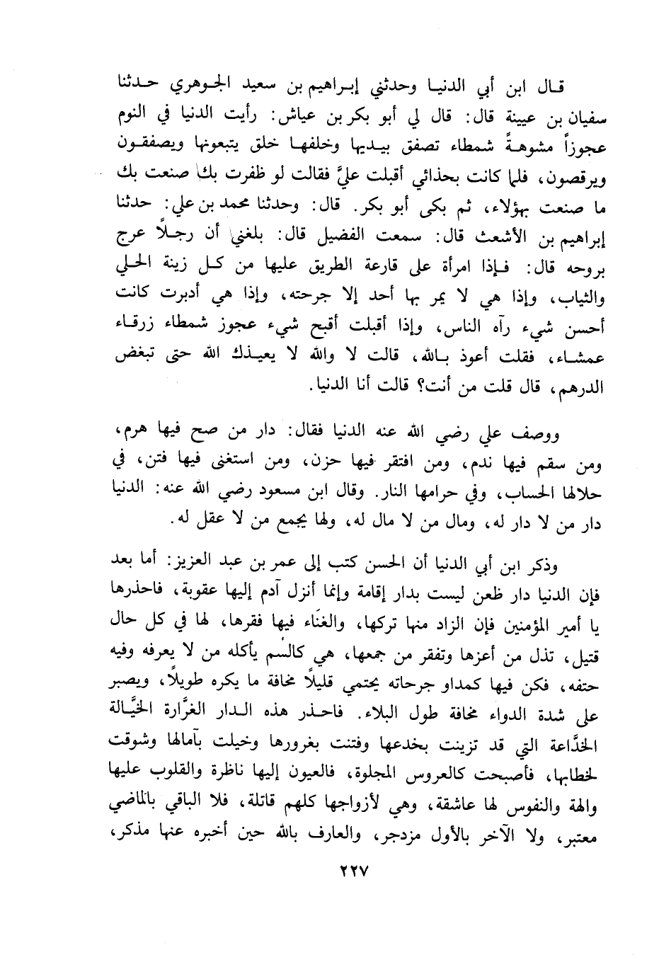 قال ابن أبي الدنيا وحدثنى ابراهيم بن سعيد الجوهرى حدثنا سفيان بن عيينة قال قال لى أبو بكر بن عياش رأيت الدنيا فى النوم عجوزا مشوها شمطاء تصفق بيديها وخلفها خلق يتبعونها ويصفقون ويرقصون فلما كانت بحذائى أقبلت على فقالت لو ظفرت بك صنعت بك ما صنعت بهؤلاء ثم بكى أبو بكر قال وحدثنا محمد بن على حدثنا ابراهيم بن الاشعث قال سمعت الفضيل قال بلغنى أن رجلا عرج بروحه قال فاذا امرأة على قارعة الطريق عليها من كل زينة الحلى والثياب واذا هى لا يمر بها أحد إلا جرحته وإذا هى أدبرت كانت أحسن شيء رآه الناس واذا أقبلت أقبح شئ عجوز شمطاء زرقاء عمشاء فقلت أعوذ بالله قالت لا والله لا يعيذك الله حتى تبغض الدرهم قال قلت من أنت قالت أنا الدنيا