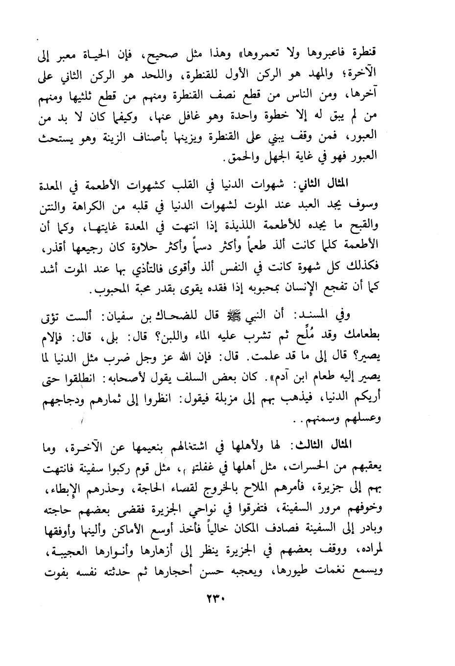 المثال الثالث: لها ولأهلها فى اشتغالهم بنعيمها عن الآخرة وما يعقبهم من الحسرات مثل أهلها فى غفلتهم مثل قوم ركبوا سفينة فانتهت بهم الى جزيرة فأمرهم الملاح بالخروج لقضاء الحاجة وحذرهم الابطاء وخوفهم مرور السفينة فتفرقوا فى نواحى الجزيرة فقضى بعضهم حاجته وبادر الى السفينة فصادف المكان خاليا فأخذ أوسع الأماكن وألينها وأوفقها لمراده ووقف بعضهم فى الجزيرة ينظر الى أزهارها وأنوارها العجيبة ويسمع نغمات طيورها ويعجبه حسن أحجارها ثم حدثته نفسه بفوت