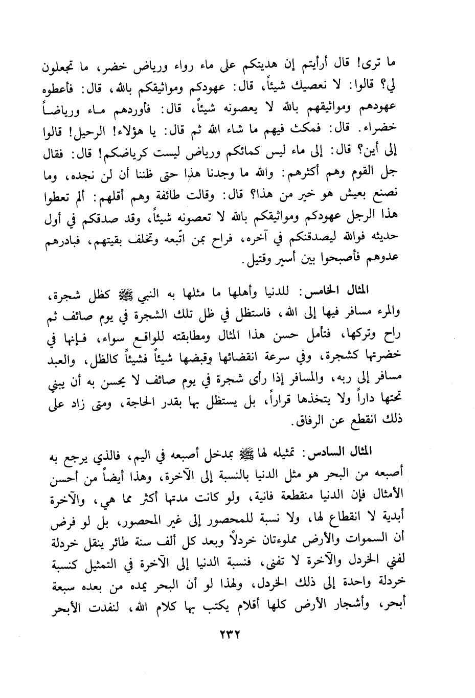 المثال السادس: تمثيله لها بمدخل أصبعه فى اليم فالذى يرجع به أصبعه من البحر هو مثل الدنيا بالنسبة الى الآخرة وهذا أيضا من أحسن الامثال فإن الدنيا منقطعة فانية ولو كانت مدتها أكثر مما هى والاخرة أبدية لا انقطاع لها ولا نسبة للمحصور الى غير المحصور بل لو فرض أن السموات والارض مملوءتان خردلا وبعد كل ألف سنة طائر ينقل خردلة لفنى الخردل والاخرة لا تفنى فنسبة الدنيا الى الآخرة فى التمثيل كنسبة خردلة واحدة الى ذلك الخردل ولهذا لو أن البحر يمده من بعده سبعة أبحر وأشجار الارض كلها أقلام يكتب بها كلام الله لنفذت الابحر