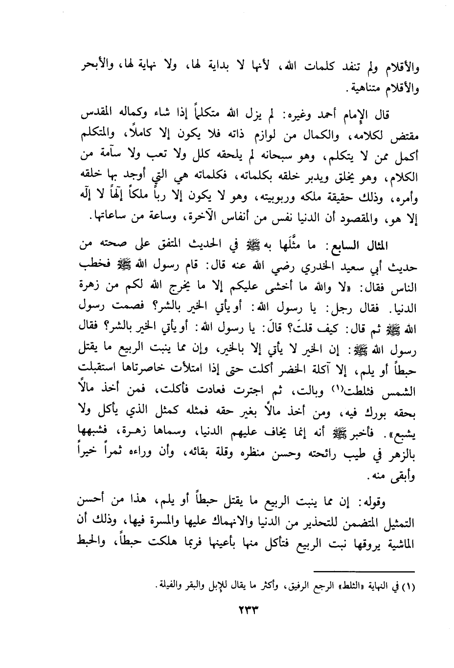 المثال السابع: ما مثلها به فى الحديث المتفق على صحته من حديث أبى سعيد الخدرى رضى الله عنه قال: "قام رسول الله فخطب الناس فقال لا والله ما أخشى عليكم الا ما يخرج الله لكم من زهرة الدنيا فقال رجل يا رسول الله أو يأتى الخير بالشر فصمت رسول الله ثم قال كيف قلت قال يا رسول الله أو يأتى الخير بالشر فقال رسول الله ان الخير لا يأتى الا بالخير وان مما ينبت الربيع ما يقتل حبطا أو يلم الا آكله الخضر أكلت حتى إذا امتلأت خاصرتاها استقبلت الشمس فتطلت وبالت ثم اجترت فعادت فأكلت قمن أخذ مالا بحقه بورك له فيه ومن أخذ مالا بغير حقه فمثله كمثل الذى يأكل ولا يشبع" فأخبر أنه انما يخاف عليهم الدنيا وسماها زهرة فشبهها بالزهر فى طيب رائحته وحسن منظره وقله بقائه وأن وراءه ثمرا خيرا وابقى منه