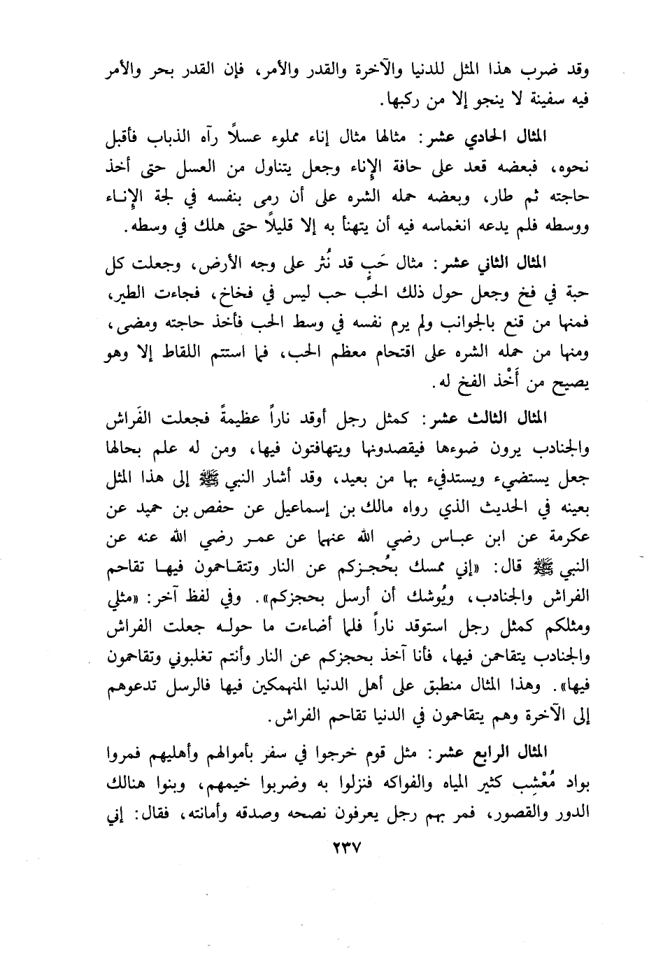 المثال الثالث عشر: كمثل رجل أوقد نارا عظيمة فجعلت الفراش والجنادب يرون ضوءها فيقصدونها ويتهافتون فيها ومن له علم بحالها جعل يستضىء ويستدفئ بها من بعيد وقد أشار النبى الى هذا المثل بعينه فى الحديث الذى رواه مالك بن اسماعيل عن حفص بن حميد عن عكرمة عن ابن عباس رضى الله عنهما عن عمر رضى الله عنه عن النبى قال: "انى ممسك بحجزكم عن النار وتتقاحمون فيها تقاحم الفراش والجنادب ويوشك أن أرسل بحجزكم" وفى لفظ آخر: "مثلى ومثلكم كمثل رجل استوقد نارا فلما أضاءت ما حوله جعلت الفراش والجنادب يتقاحمن فيها فأنا آخذ بحجزكم عن النار وأنتم تغلبونى وتتقاحمون فيها" وهذا المثال مطبق على أهل الدنيا المنهمكين فيها فالرسل تدعوهم الى الاخرة وهم يتقاحمون فى الدنيا تقاحم الفراش