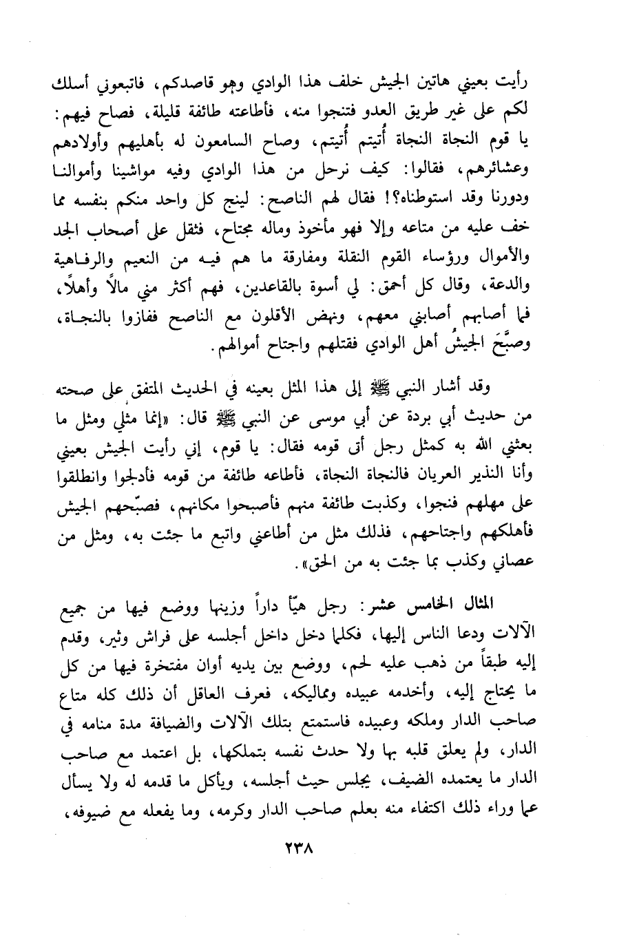 رأيت بعينى هاتين الجيش خلف هذا الوادى وهو قاصدكم فاتبعونى أسلك بكم على غير طريق العدو فتنجوا منه فأطاعته طائفة قليلة فصاح فيهم يا قوم النجاة النجاة أتيتم أتيتم وصاح السامعون له بأهليهم وأولادهم وعشائرهم فقالوا كيف نرحل من هذا الوادى وفيه مواشينا وأموالنا ودورنا وقد استوطناه فقال لهم الناصح لينج كل واحد منكم بنفسه مما خف عليه من متاعه والا فهو مأخوذ وماله مجتاح فثقل على أصحاب الجد والأموال ورؤساء القوم النقلة ومفارقة ما هم فيه من النعيم والرفاهية والدعة وقال كل أحمق لى أسوة بالقاعدين فهم أكثر منى مالا وأهلا فما أصابهم أصابنى معهم ونهض الأقلون مع الناصح ففازوا بالنجاة وصبح الجيش أهل الوادى فقتلهم واجتاح أموالهم