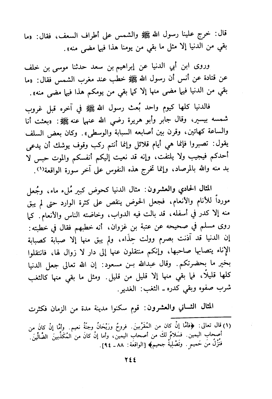 فالدنيا كلها كيوم واحد بعث رسول الله فى آخره قبل غروب شمسه بيسير وقال جابر وأبو هريرة رضى الله عنهما عنه: "بعثت أنا والساعة كهاتين وقرن بين أصابعه السبابة والوسطى" وكان بعض السلف يقول تصبروا فإنما هى أيام قلائل وانما أنتم ركب وقوف يوشك أن يدعى أحدكم فيجيب ولا يلتفت وانه قد نعيت اليك أنفسكم والموت حبس لا بد منه والله بالمرصاد وانما تخرج هذه النفوس على آخر سورة الواقعة