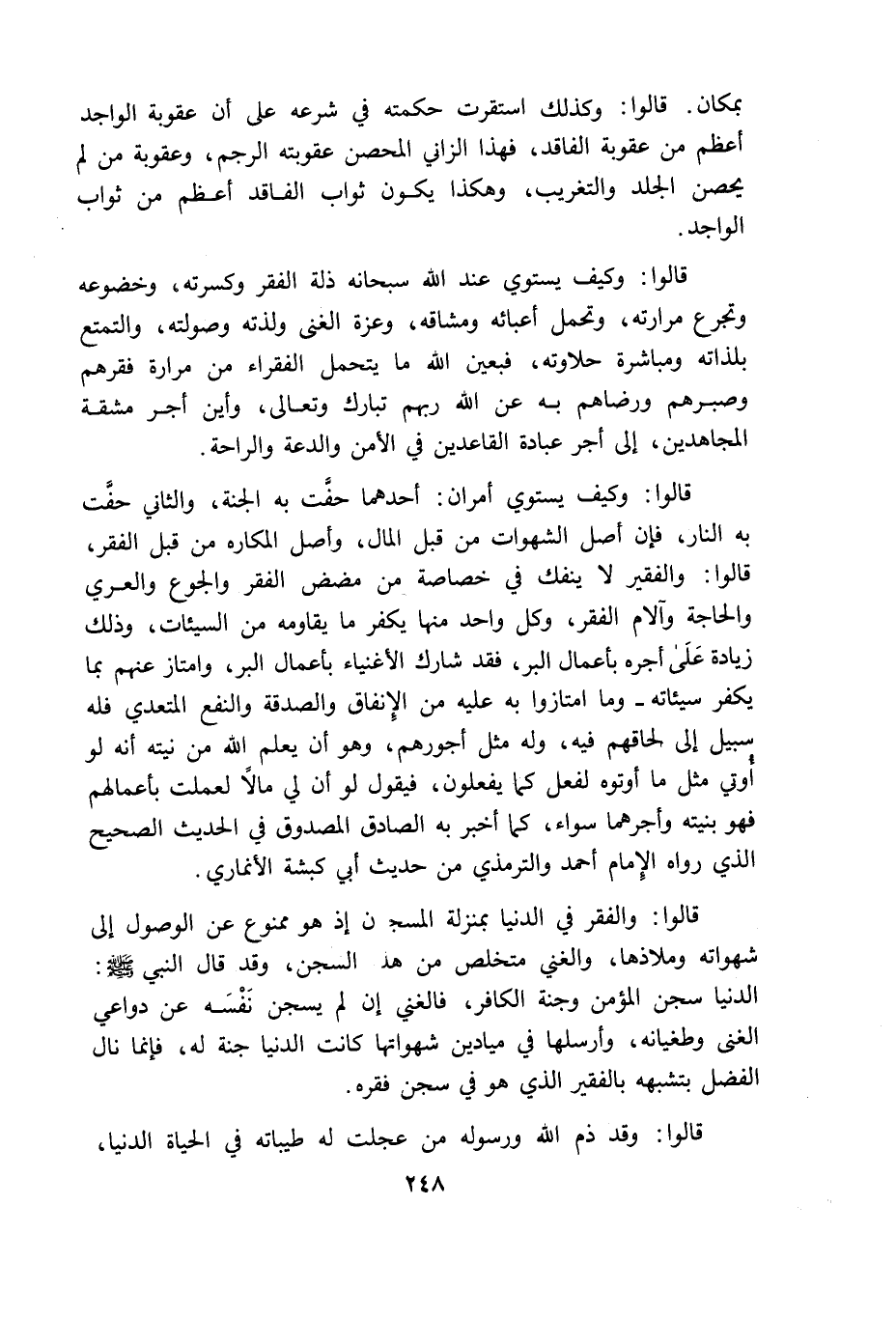 قالوا وكيف يستوى أمران أحدهما حفت به الجنة والثانى حفت به النار فإن أصل الشهوات من قبل المال وأصل المكاره من قبل الفقر قالوا والفقير لا ينفك في خصاصة من مضض الفقر والجوع والعرى والحاجه وآلام الفقر وكل واحد منها يكفر ما يقاومه من السيئات وذلك زيادة على أجره بأعمال البر فقد شارك الاغنياء بأعمال البر وامتاز عنهم بما يكفر سيئاته وما امتازوا به عليه من الانفاق والصدقة والنفع المتعدي فله سبيل الى لحاقهم فيه وله مثل أجورهم وهو أن يعلم الله من نيته أنه لو أوتى مثل ما أوتوه لفعل كما يفعلون فيقول لو أن لى مالا لعملت بأعمالهم فهو بنيته وأجرهما سواء كما أخبر به الصادق المصدوق فى + الحديث الصحيح + الذى رواه الامام أحمد والترمذى من حديث أبى كبشه الانمارى