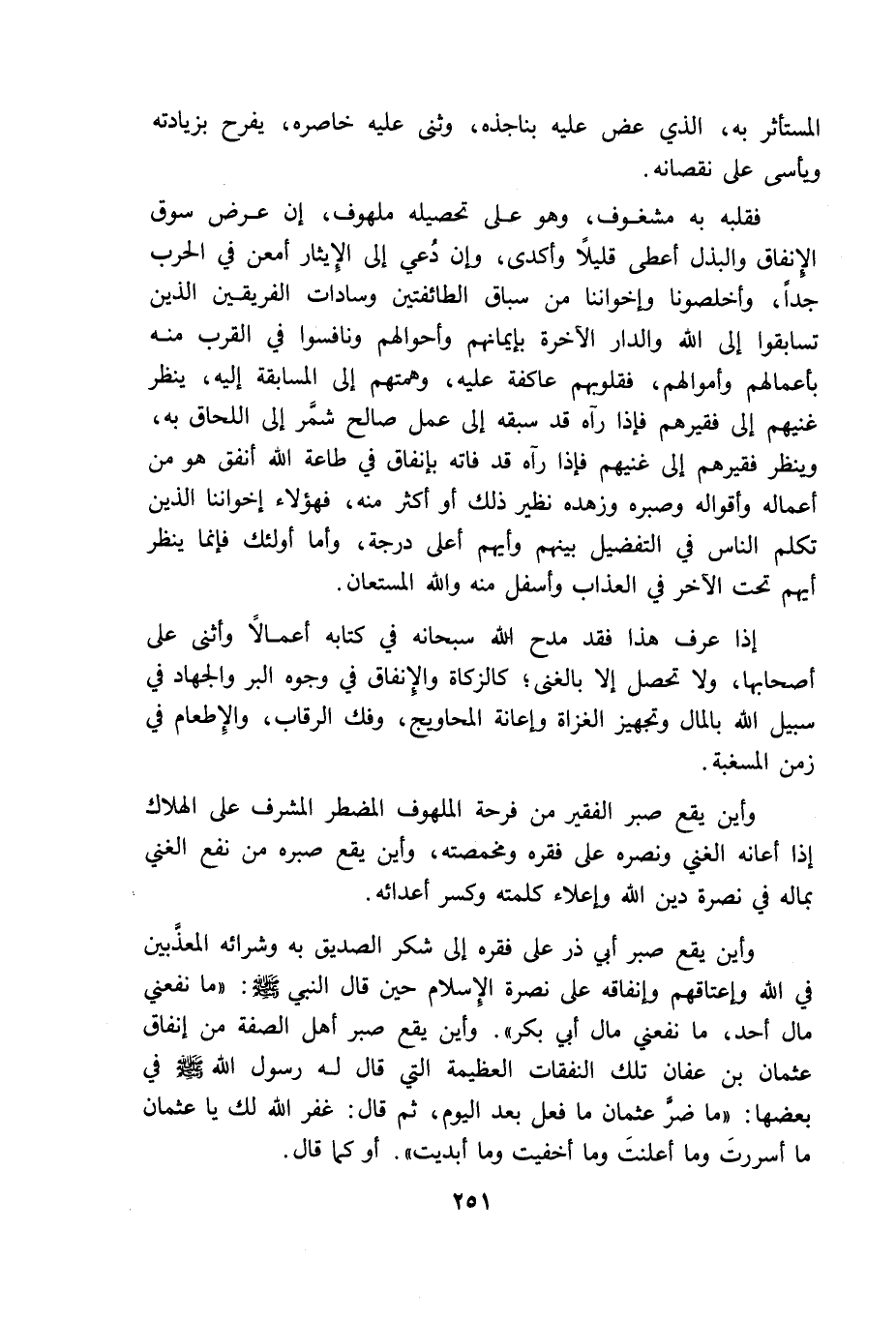وأين يقع صبر أبى ذر على فقره إلى شكر الصديق به وشرائه المعذبين فى الله وإعتاقهم وإنفاقه على نصرة الاسلام حين قال النبى: "ما نفعنى مال احد ما نفعنى مال أبى بكر" وأين يقع صبر أهل الصفة من إنفاق عثمان بن عفان تلك النفقات العظيمة التى قال له رسول الله فى بعضها: "ما ضر عثمان ما فعل بعد اليوم ثم قال غفر الله لك يا عثمان ما أسررت وما أعلنت وما أخفيت وما أبديت" أو كما قال.