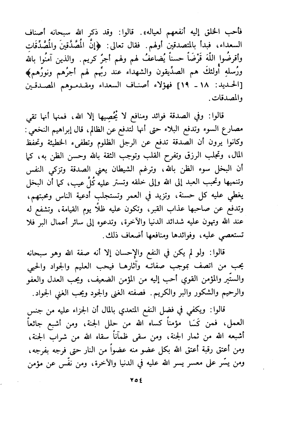 فأحب الخلق اليه انفعهم لعياله" قالوا وقد ذكر الله سبحانه اصناف السعداء فبدأ بالمتصدقين أولهم فقال تعالى {إِنَّ الْمُصَّدِّقِينَ وَالْمُصَّدِّقَاتِ وَأَقْرَضُوا اللَّهَ قَرْضاً حَسَناً يُضَاعَفُ لَهُمْ وَلَهُمْ أَجْرٌ كَرِيمٌ وَالَّذِينَ آمَنُوا بِاللَّهِ وَرُسُلِهِ أُولَئِكَ هُمُ الصِّدِّيقُونَ وَالشُّهَدَاءُ عِنْدَ رَبِّهِمْ لَهُمْ أَجْرُهُمْ وَنُورُهُمْ} فهؤلاء أصناف السعداء ومقدموهم المصدقين والمصدقات