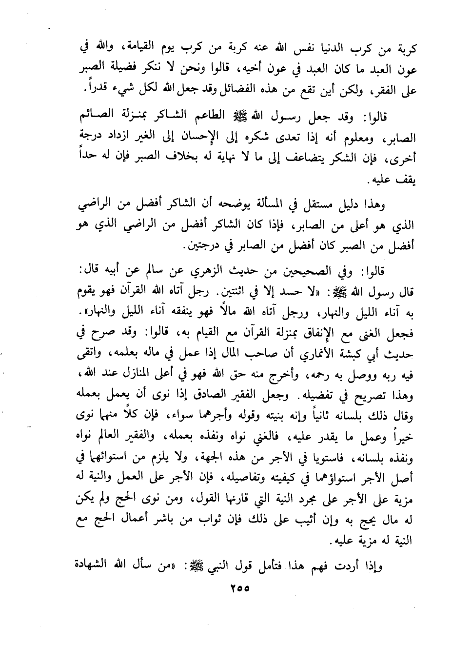 وهذا دليل مستقل فى المسألة يوضحه أن الشاكر أفضل من الراضى الذى هو أعلى من الصابر فاذا كان الشاكر أفضل من الراضى الذى هو أفضل من الصابر كان أفضل من الصابر فى درجتين