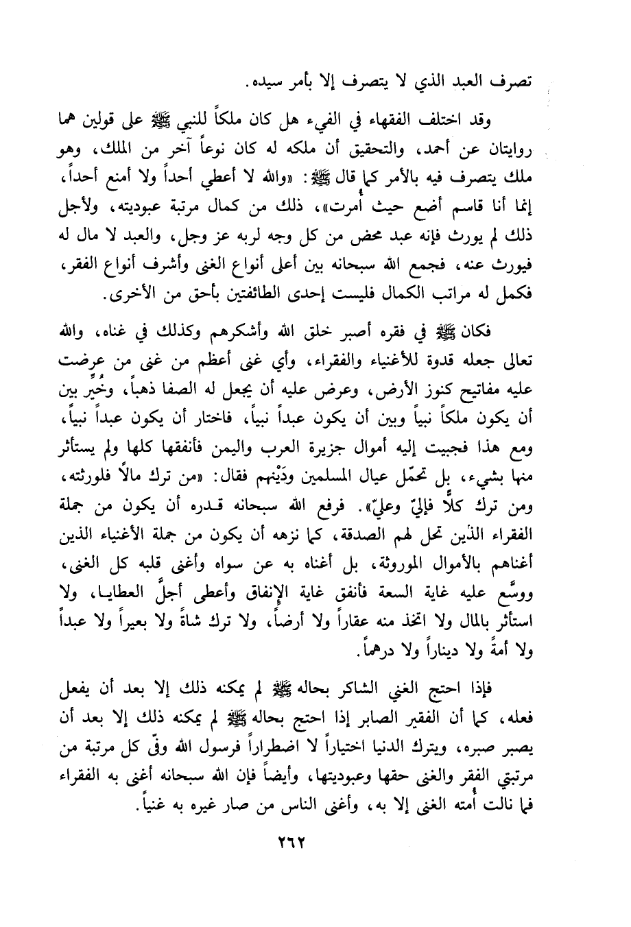 فكان فى فقره أصبر خلق الله وأشكرهم وكذلك فى غناه والله تعالى جعله قدوة للأغنياء والفقراء وأى غنى أعظم من غنى من عرضت عليه مفاتيح كنوز الارض وعرض عليه أن يجعل له الصفا ذهبا وخير بين أن يكون ملكا نبيا وبين أن يكون عبدا نبيا فاختار أن يكون عبدا نبيا ومع هذا فجيبت اليه أموال جزيرة العرب واليمن فأنفقها كلها ولم يستأثر منها بشئ بل تحمل عيال المسلمين ودينهم فقال من ترك مالا فلورثته ومن ترك كلا فإلى وعلى فرفع الله سبحانه قدره أن يكون من جملة الفقراء الذين تحل لهم الصدقه كما نزهه أن يكون من جملة الاغنياء الذين أغناهم بالاموال الموروثة بل أغناه به عن سواه وأغنى قلبه كل الغنى ووسع عليه غاية السعة فأنفق غاية الانفاق وأعطى أجل العطايا ولا استأثر بالمال ولا اتخذ منه عقارا ولا ارضا ولا ترك شاة ولا بعيرا ولا عبدا ولا أمة ولا دينارا ولا درهما