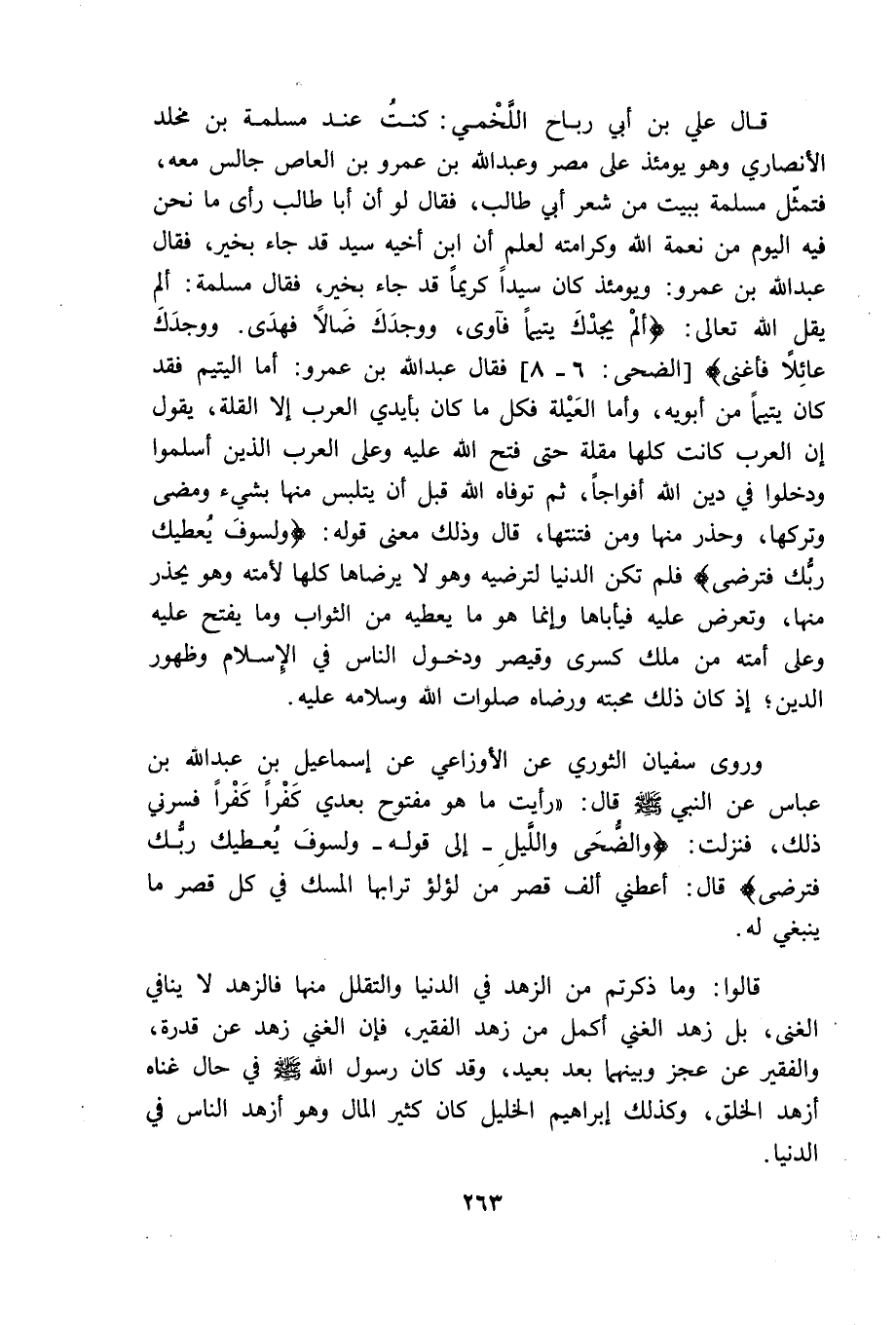 قال على بن أبى رباح اللخمى: كنت عند مسلمة بن مخلد الأنصارى وهو يومئذ على مصر وعبد الله بن عمرو بن العاص جالس معه فتمثل مسلمة ببيت من شعر أبى طالب فقال لو أن ابا طالب رأى ما نحن فيه اليوم من نعمة الله وكرامته لعلم أن ابن أخيه سيد قد جاء بخير فقال عبد الله بن عمرو ويومئذ كان سيدا كريما قد جاء بخير فقال مسلمة ألم يقل الله تعالى {أَلَمْ يَجِدْكَ يَتِيماً فَآوَى وَوَجَدَكَ ضَالاً فَهَدَى وَوَجَدَكَ عَائِلاً فَأَغْنَى} فقال عبد الله بن عمرو أما اليتيم فقد كان يتيما من أبويه وأما لعيلة فكل ما كان بأيدى العرب الى القله يقول إن العرب كانت كلها مقلة حتى فتح الله عليه وعلى العرب الذين اسلموا ودخلوا فى دين الله أفواجا ثم توفاه الله قبل أن يتلبس منها بشئ ومضى وتركها وحذر منها ومن فتنتها قال وذلك معنى قوله {وَلَسَوْفَ يُعْطِيكَ رَبُّكَ فَتَرْضَى} فلم تكن الدنيا لترضيه وهو لا يرضاها كلها لأمته وهو يحذر منها وتعرض عليه فيأباها وانما هو ما يعطيه من الثواب وما يفتح عليه وعلى أمته من ملك كسرى وقيصر ودخول الناس فى الاسلام وظهور الدين إذا كان ذلك محبته ورضاه صلوات الله وسلامه عليه