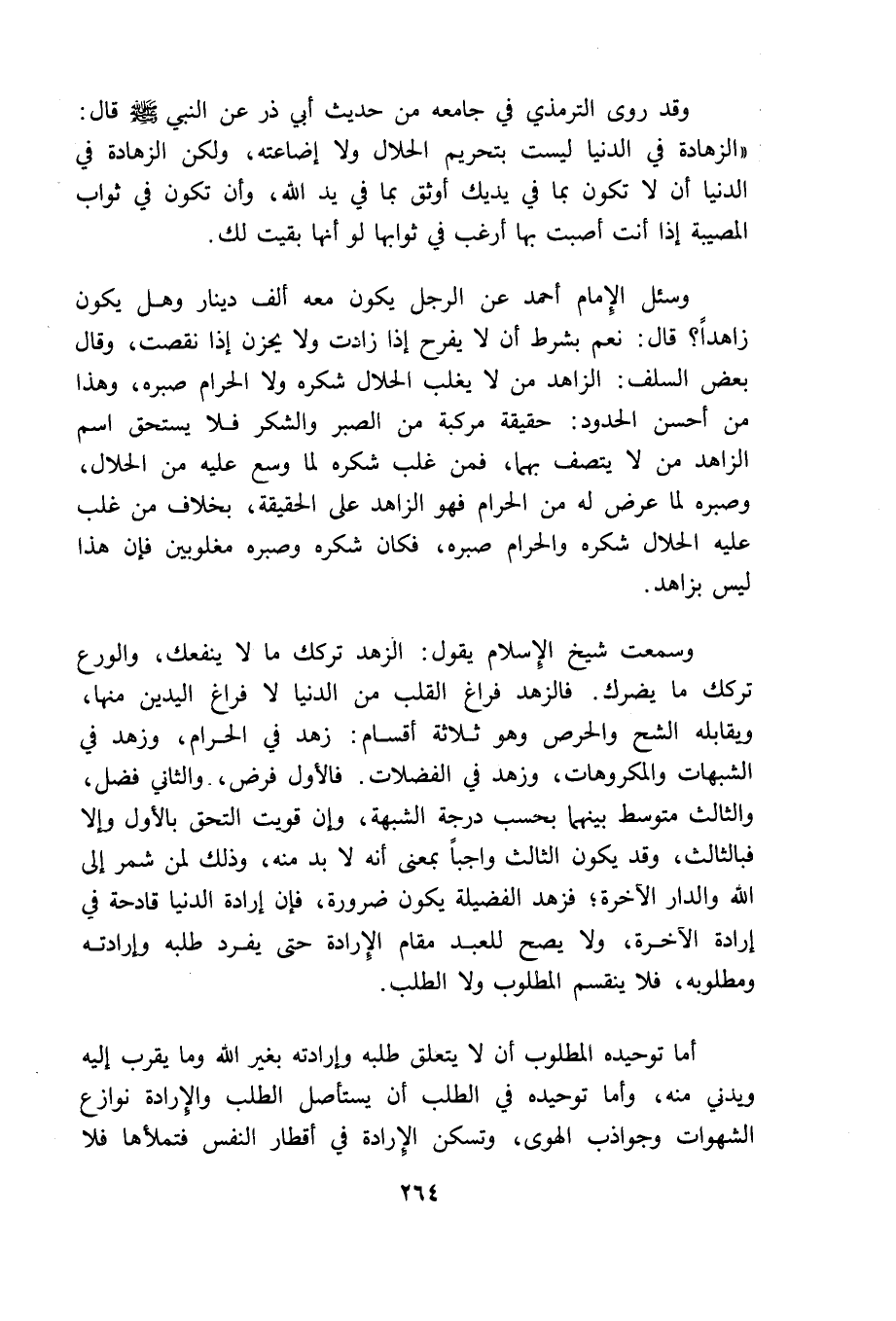 وقد روى الترمذى فى جامعه من حديث ابى ذر عن النبى قال: "الزهادة فى الدنيا ليست بتحريم الحلال ولا إضاعته ولكن الزهادة فى الدنيا أن لا تكون بما فى يديك أوثق بما فى يد الله وأن تكون فى ثواب المصيبة إذا أنت اصبت بها أرغب فى ثوابها لو أنها بقيت لك".