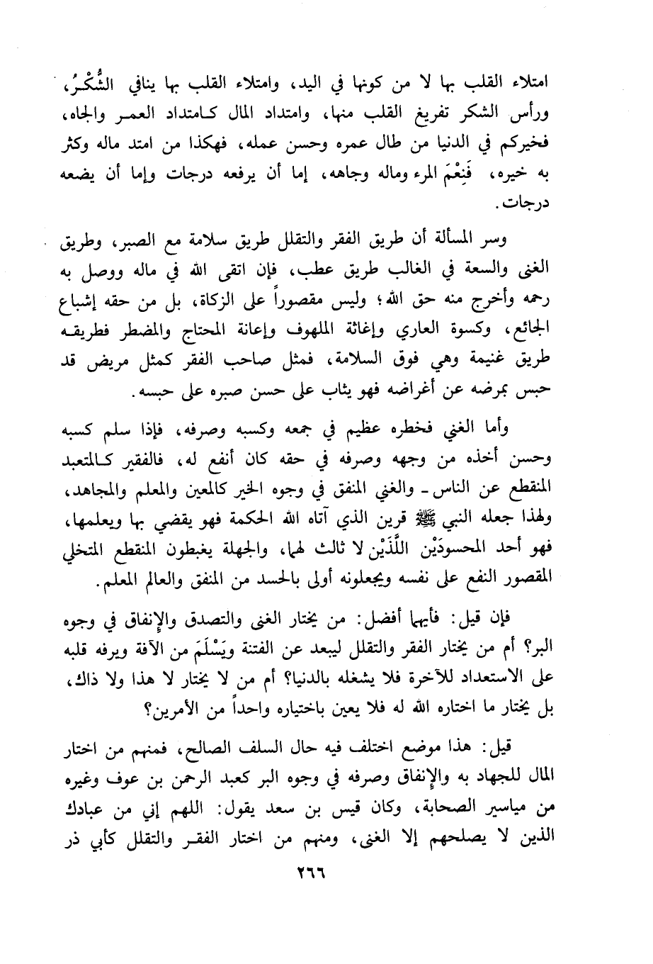 وسر المسألة أن طريق الفقر والتقلل طريق سلامة مع الصبر وطريق الغنى والسعة فى الغالب طريق عطب فإن اتقى الله فى ماله ووصل به رحمه وأخرج منه حق الله وليس مقصورا على الزكاة بل من حقه اشباع الجائع وكسوة العارى واغاثة الملهوف واعانة المحتاج والمضطر فطريقه طريق غنيمة وهى فوق السلامة فمثل صاحب الفقر كمثل مريض قد حبس بمرضه عن أغراضه فهو يثاب على حسن صبره على حبسه