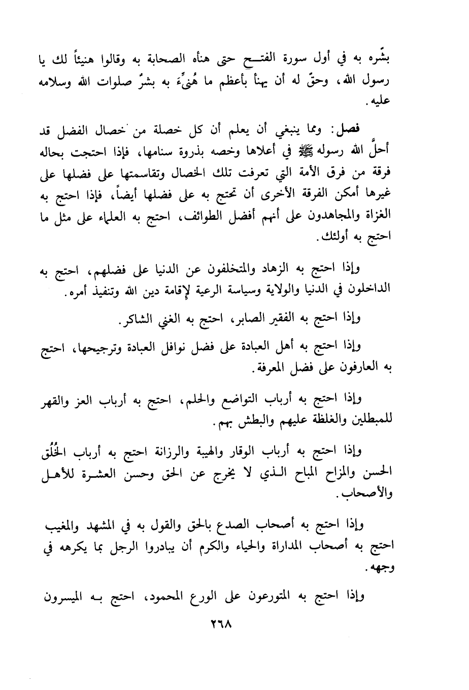فصل: ومما ينبغى أن يعلم أن كل حصلة من حصال الفضل قد أحل الله رسوله فى أعلاها وخصه بذروة سنامها فإذا احتجت بحاله فرقة من فرق الأمة التى تعرفت تلك الخصال وتقاسمتها على فضلها على عيرها أمكن الفرقة الأخرى أن تحتج به على فضلها أيضا فإذا احتج به الغزاة والمجاهدون على أنهم افضل الطوائف احتج به العلماء والفقهاء على مثل ما احتج به أولئك