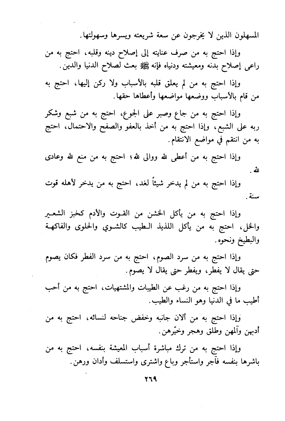وإذا احتج به من جاع وصبر على الجوع احتج به من شبع وشكر ربه على الشبع واذا احتج به من اخذ بالعفو والصفح والاحتمال احتج به من انتقم فى مواضع الانتقام