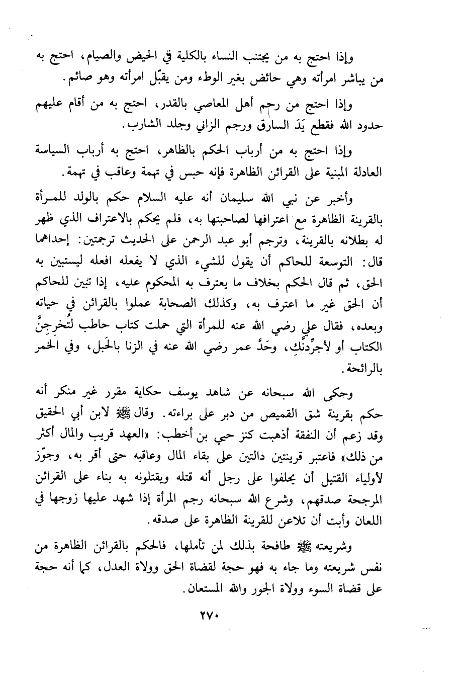 وشريعته طافحة بذلك لمن تأملها فالحكم بالقرائن الظاهرة من نفس شريعته وما جاء به فهو حجة لقضاة الحق وولاة العدل كما أنه حجة على قضاة السوء وولاة الجور والله المستعان.
