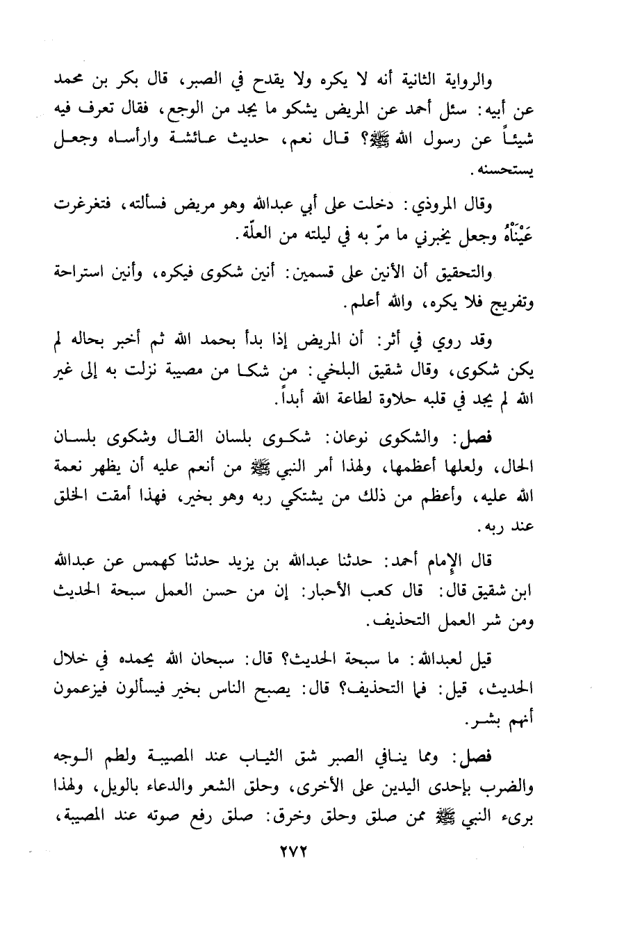 والرواية الثانية أنه لا يكره ولا يقدح في الصبر قال بكر بن محمد عن أبيه سئل احمد عن المريض يشكو ما يجد من الوجع فقال تعرف فيه شيئا عن رسول الله قال نعم حديث عائشة وارأساه وجعل يستحسنه