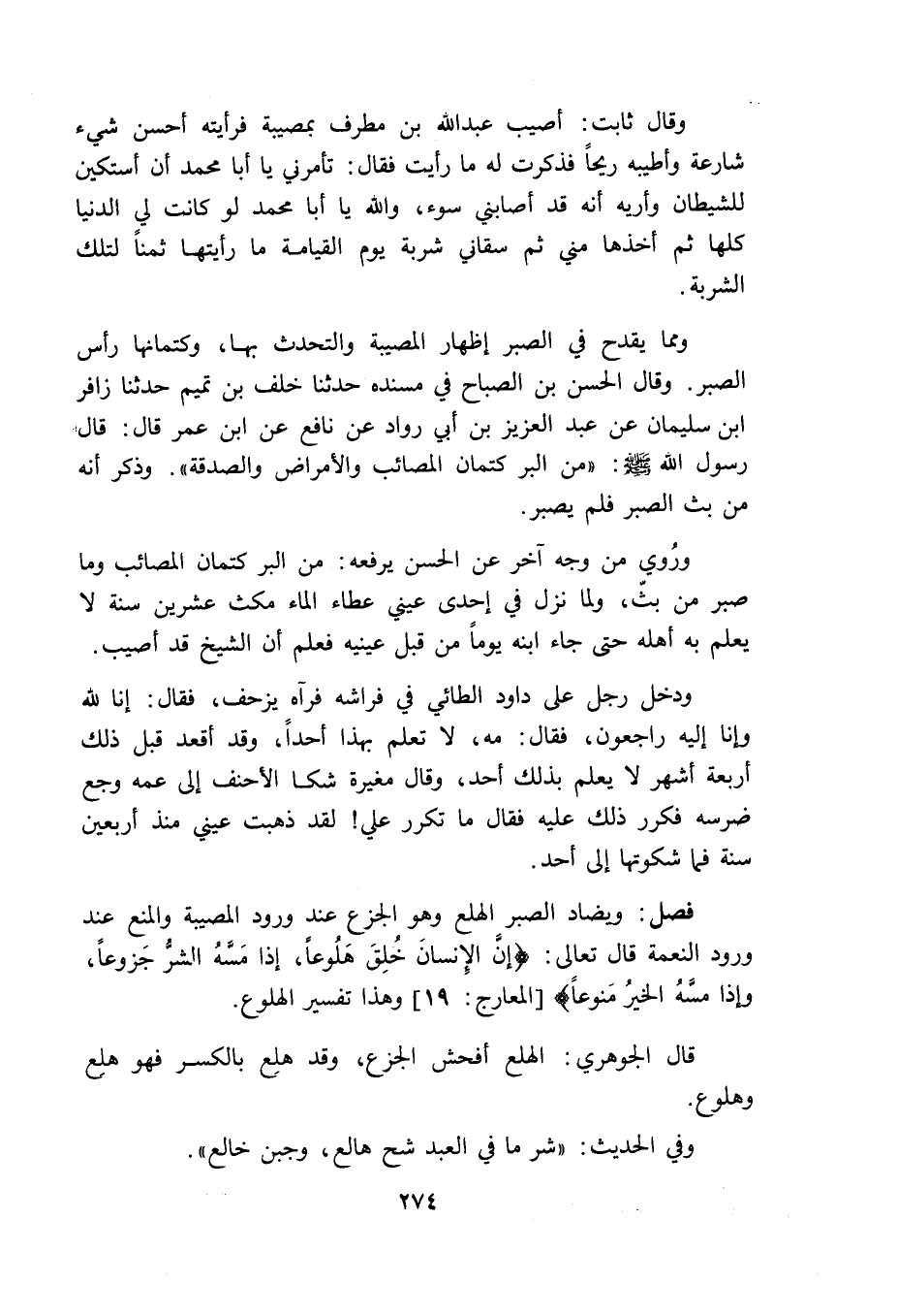 ودخل رجل على داود الطائى فى فراشه فرآه يرجف فقال انا لله وانا اليه راجعون فقال مه لا تعلم بهذا أحدا وقد أقعد قبل ذلك اربعة أشهر لا يعلم بذلك أحد وقال مغيرة شكى الاحنف الى عمه وجع ضرسه فكرر ذلك عليه فقال ما تكرر على لقد ذهبت عينى منذ أربعين سنة فما شكوتها الى أحد